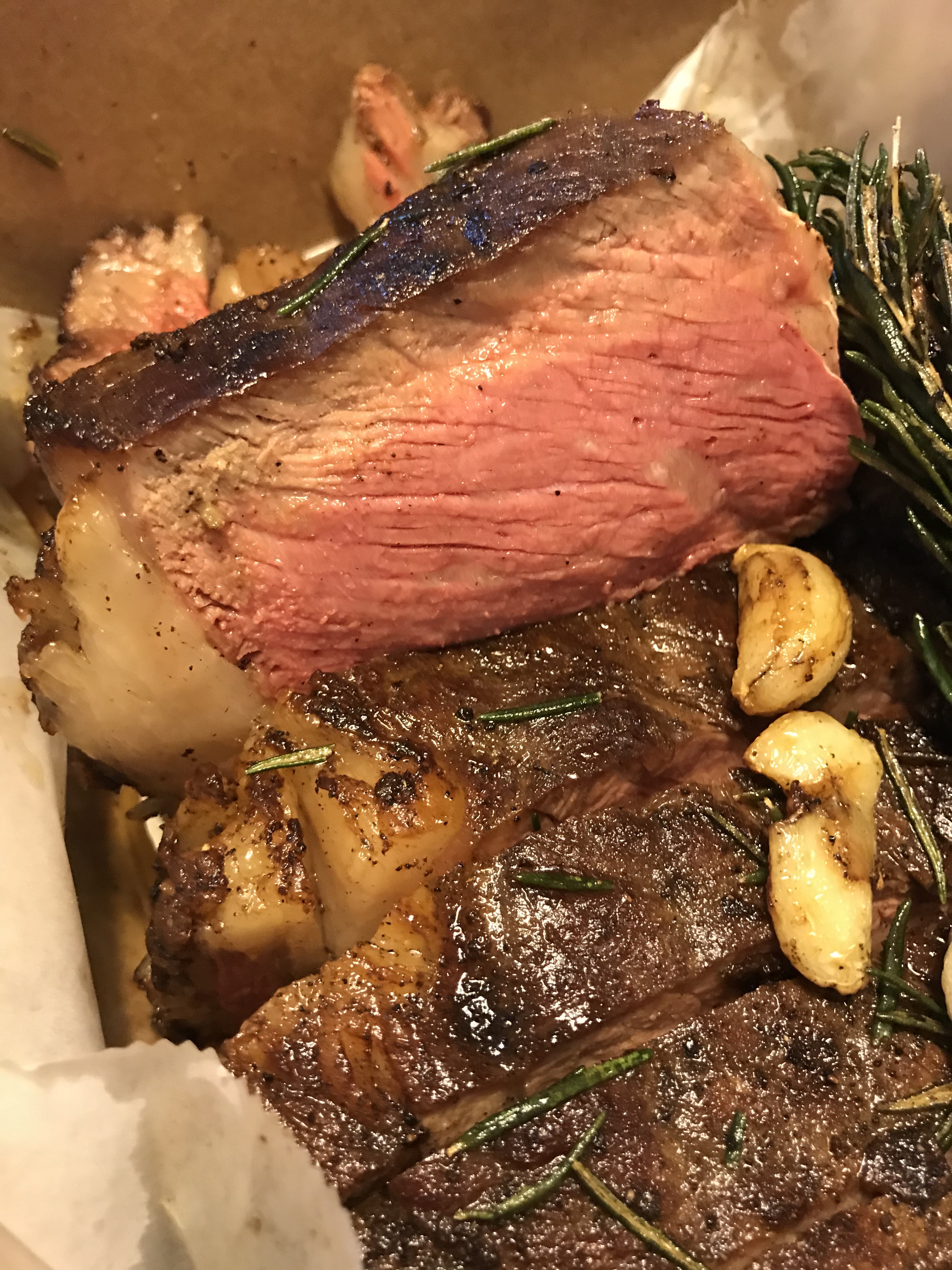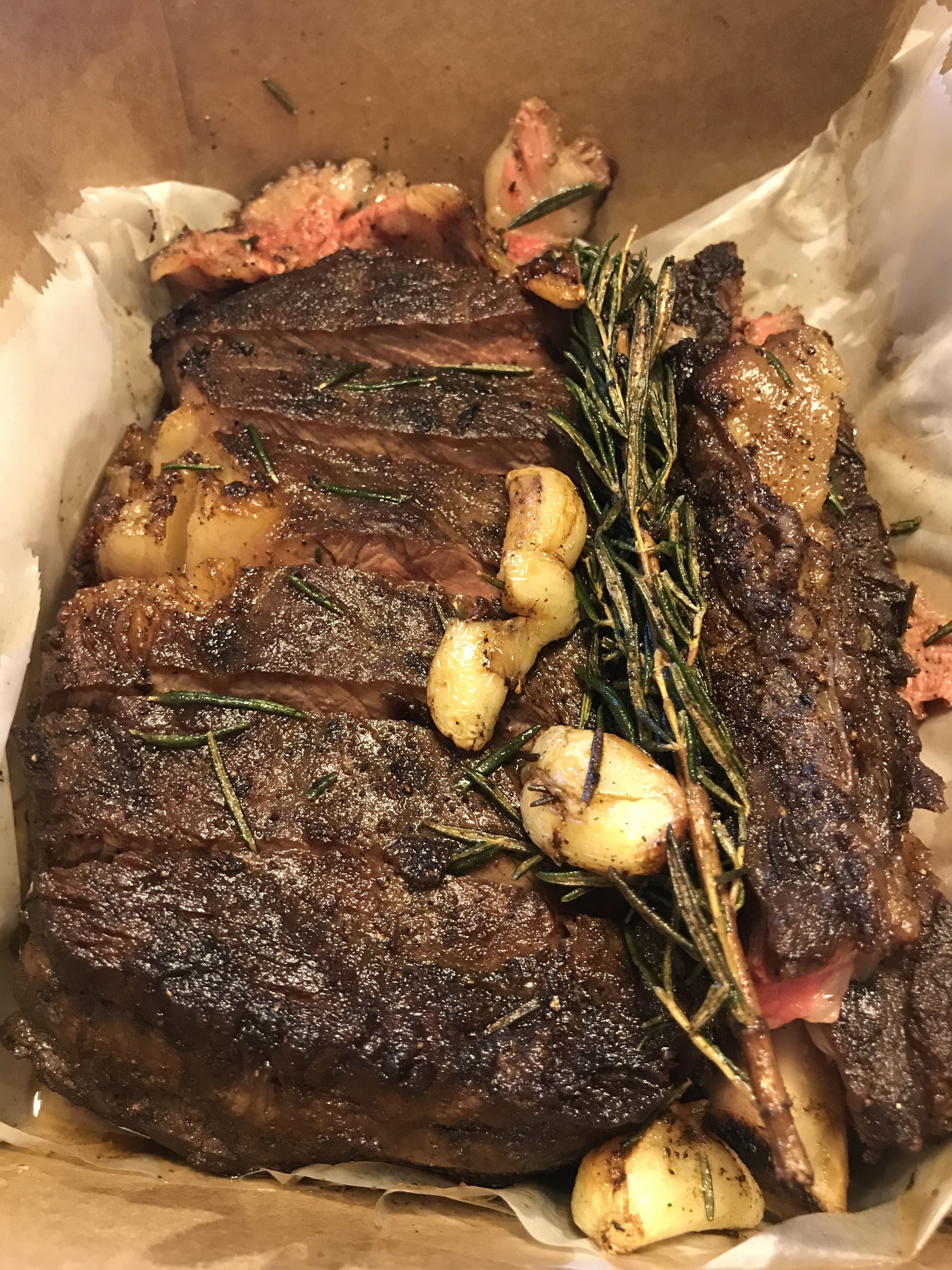Oui Bakery had a weekend Côte de Boeuf special which included two sides, focaccia, and hand pies for $75. With a hint of smoke, very beefy, delicious. Great value.