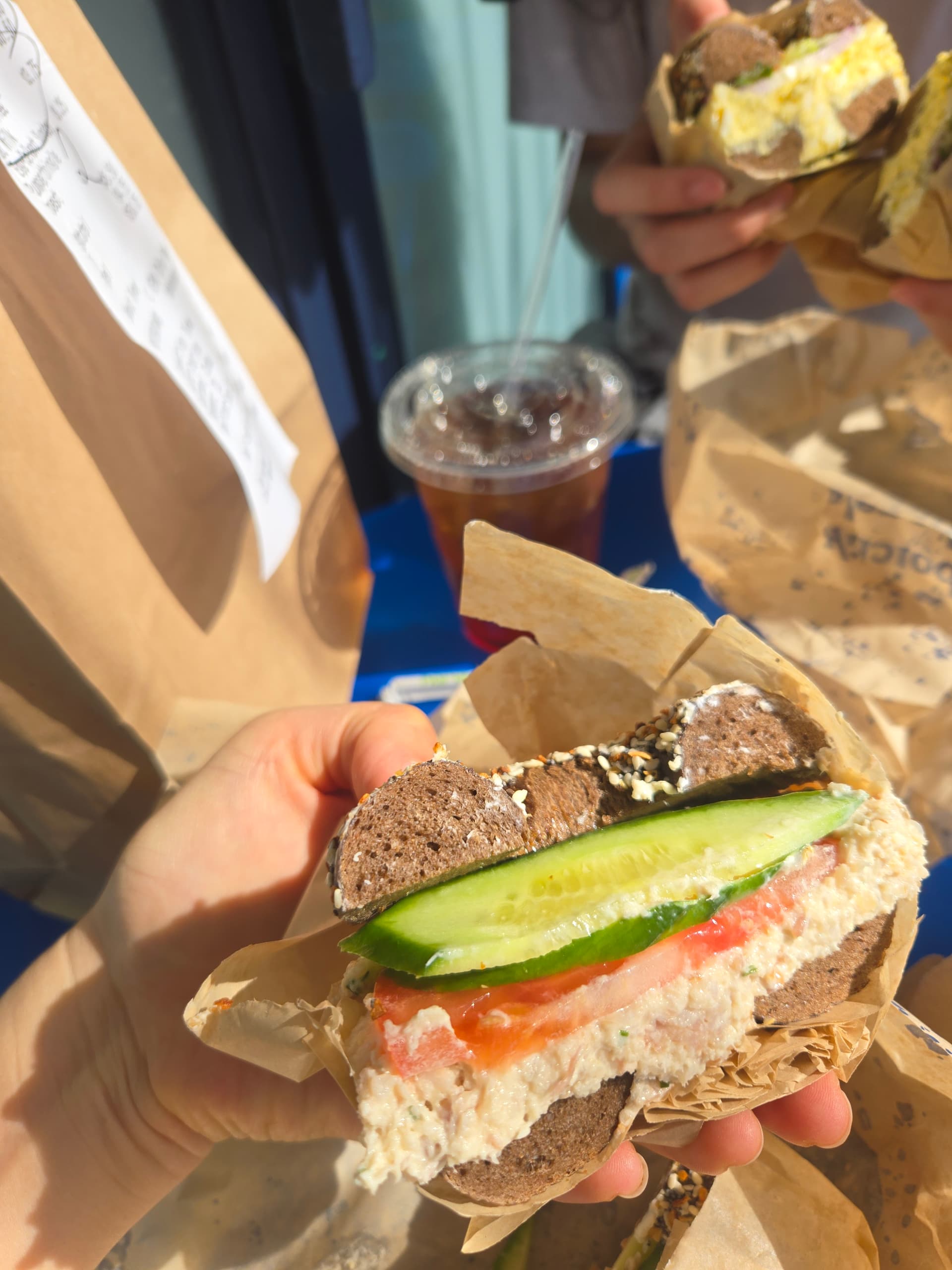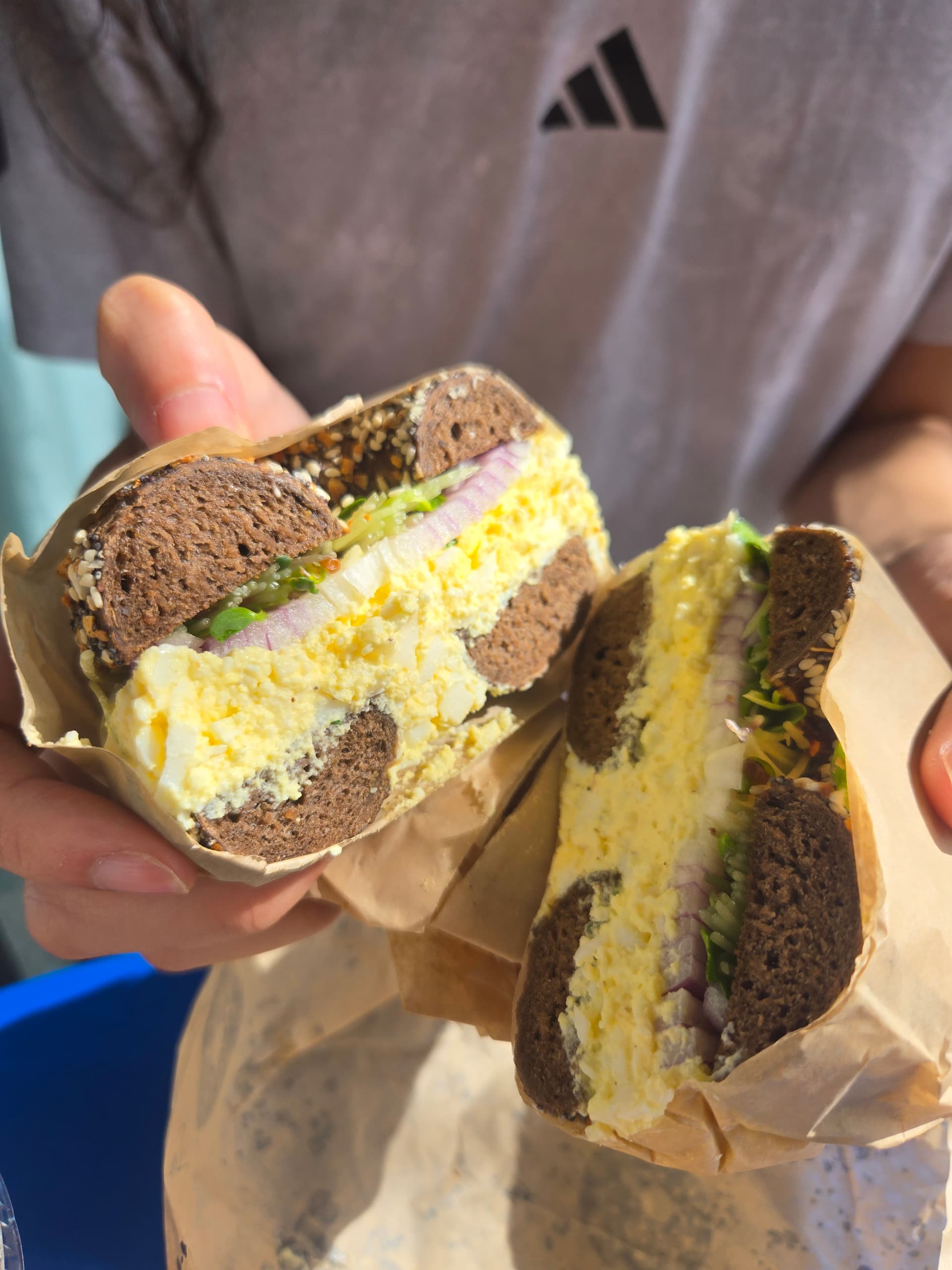 Thought the bagel was good. I’d come back if I was in the area. Their bagels are too small for their sandwiches though! I got a whitefish salad sandwich, which was good. But everything splooges out the moment you bite down, because the crumb is pretty firm. I end up irrigating the filling to different bites on my own. I’m honestly not sure if they’ve tried eating their own bagel sandwiches, because it’s pretty difficult. Also, beautiful cross-sections made for instagram, but it’s like 60% vegetable by volume in the very middle. Bagels made for Californians … Egg salad was good too.