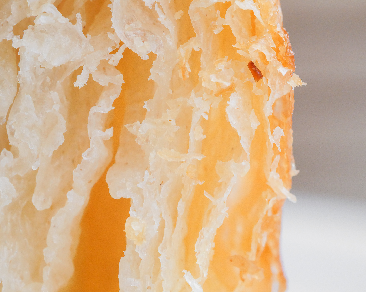 Layers of soft and elastic goodness even though the flaky outer crust isn’t in prime condition. I suspect that this might be a sourdough base judging from the mild sour flavor.