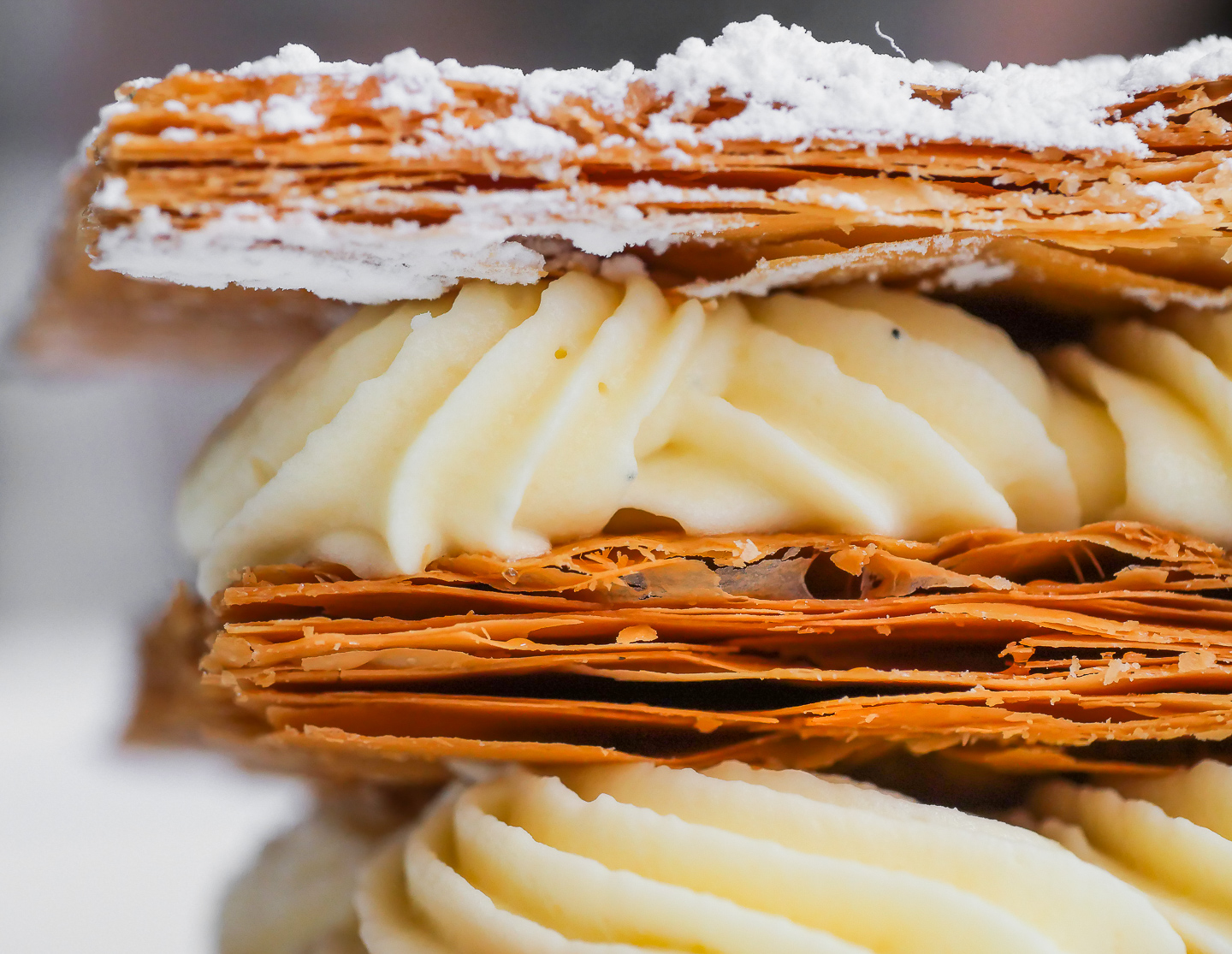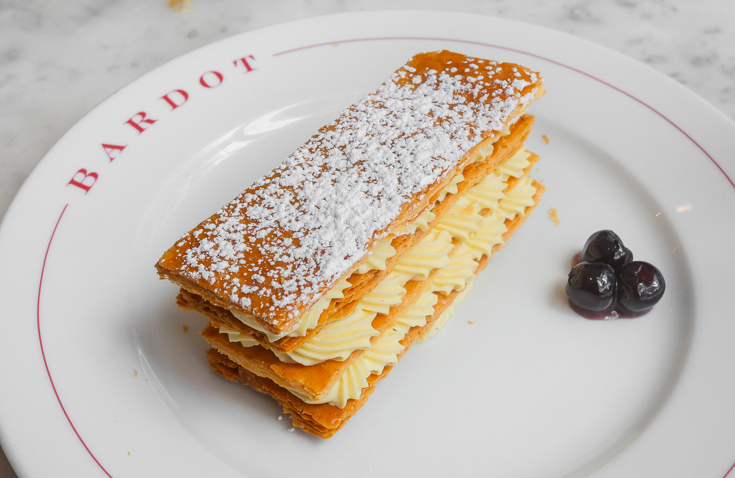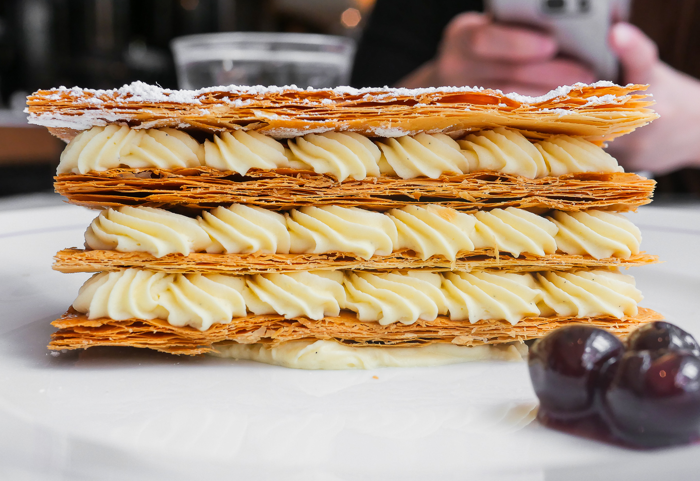 vanilla mille feuille | caramelized puff pastry, vanilla pastry cream, housemade maraschino cherries