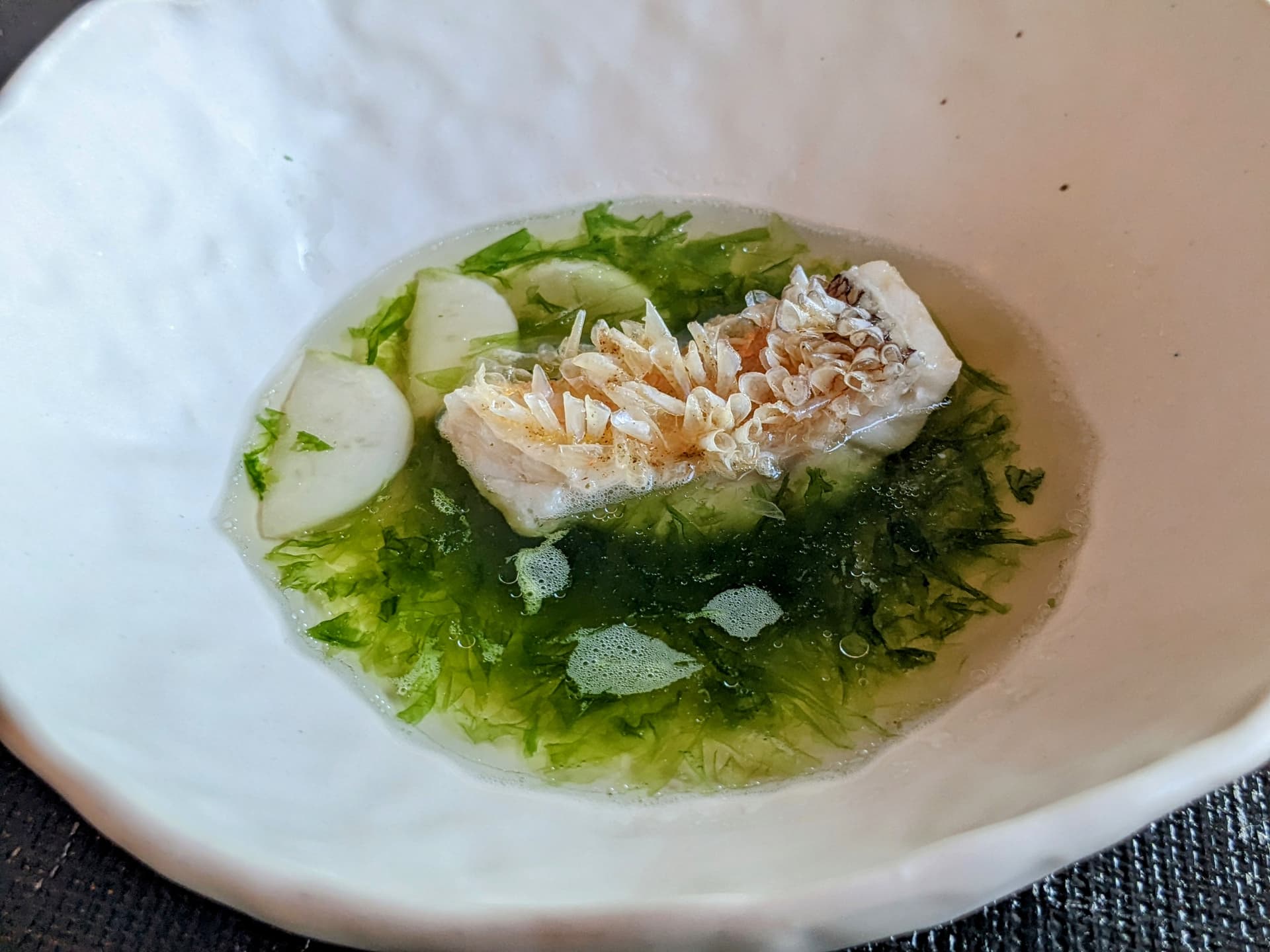aka amadai, tile fish broth, parae seaweed, tokyo turnips