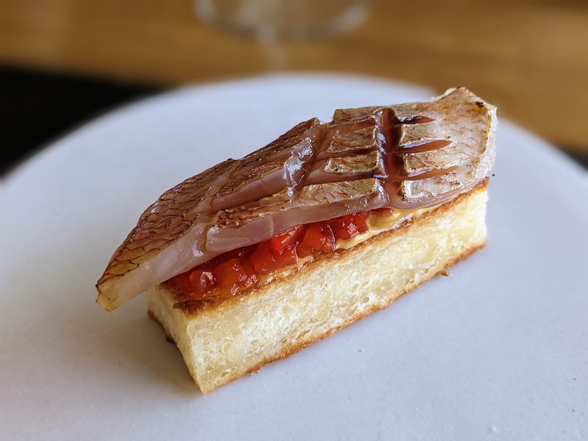 (new) kasugodai toast, homemade milk bread, pickled red peppers, aioli