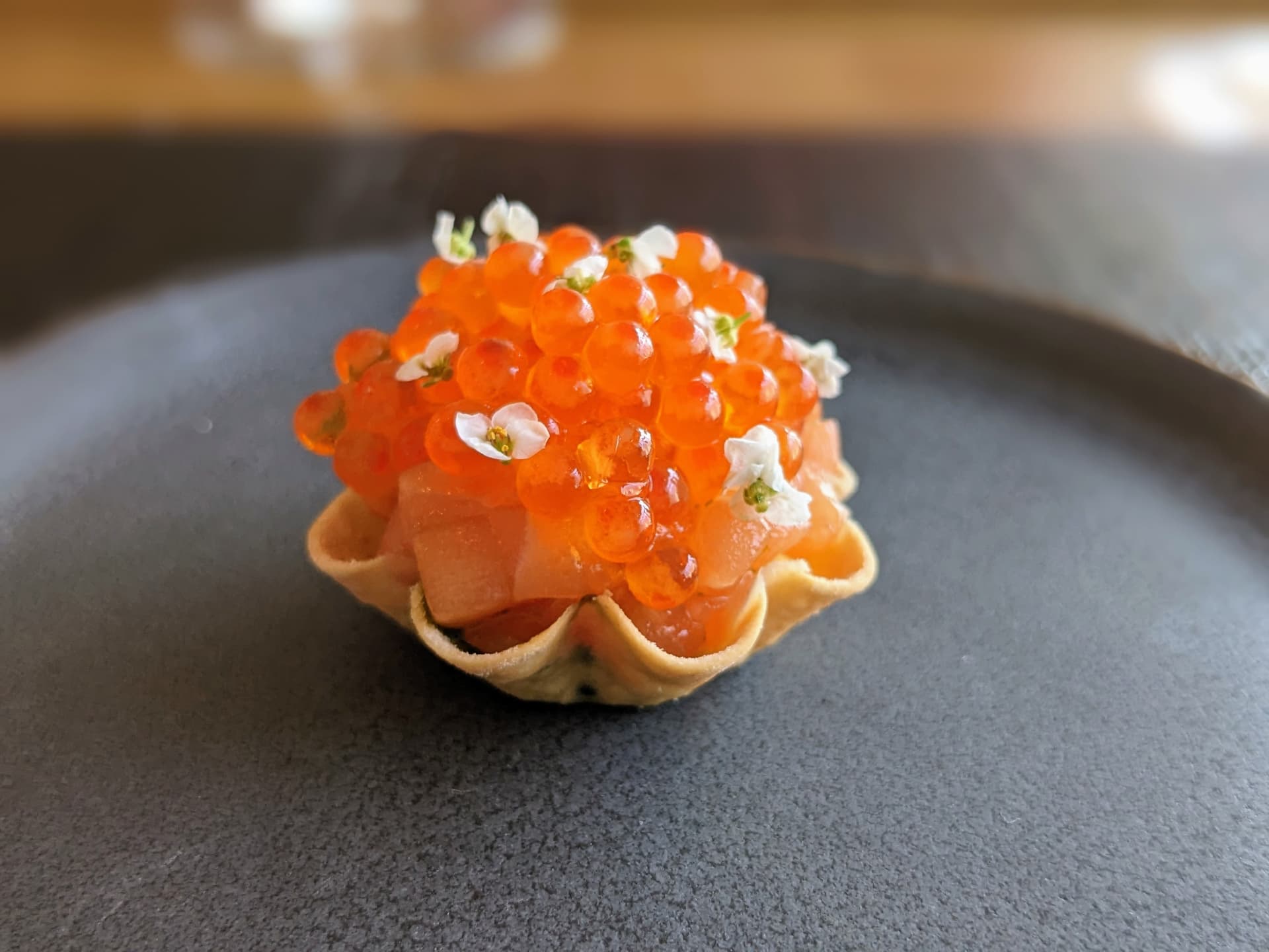 (new) hon masu tartlet, trout roe, horseradish, vidalia onions, citrus