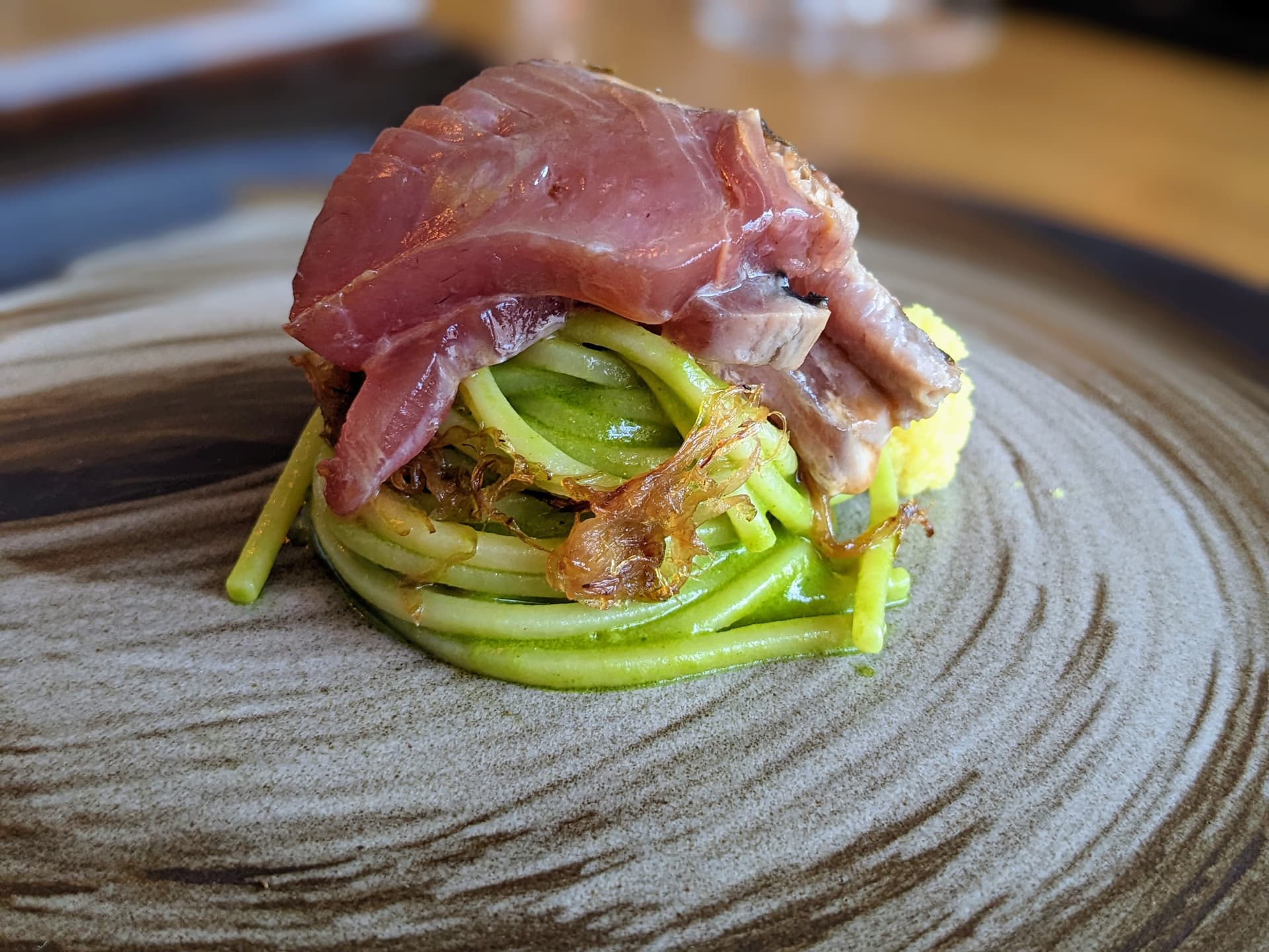 katsuo with pesto, spaghetti, shallots, grated ginger