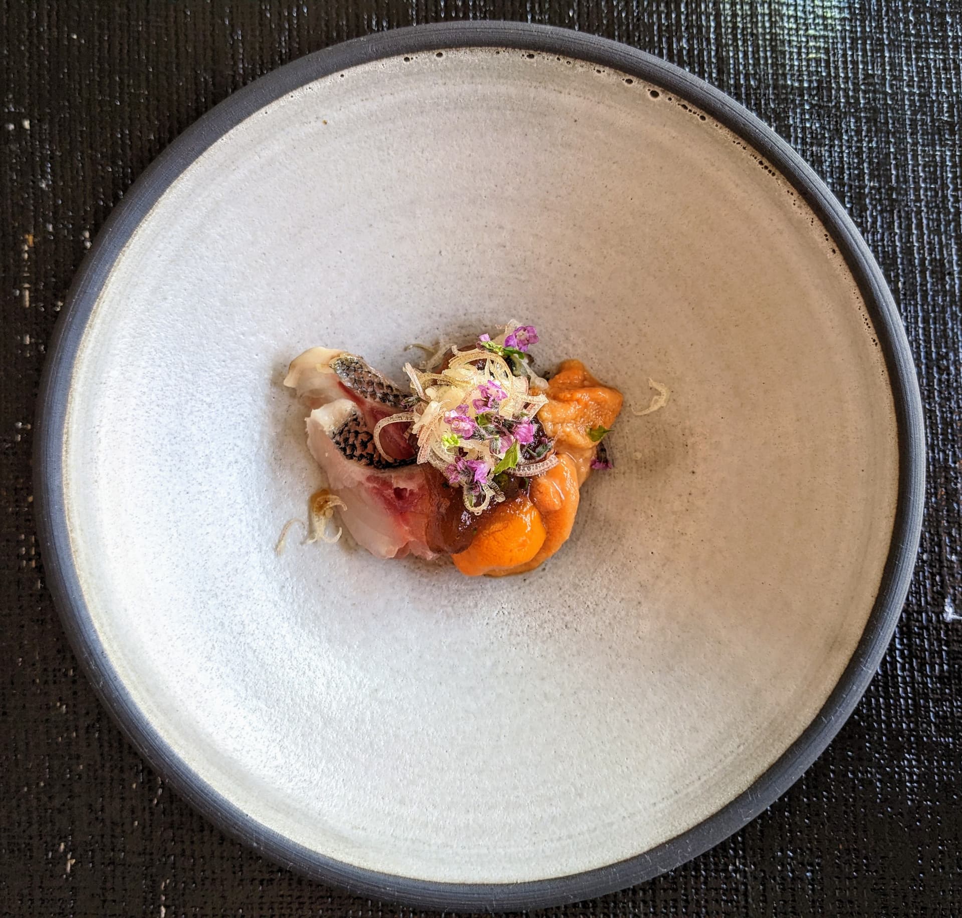 isaki with ensui uni, citrus soy gelee, myoga ginger, chives