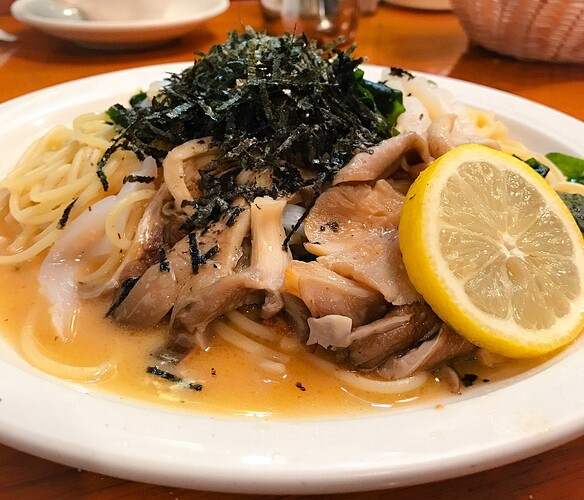 Spaghetti with tarako, squid, uni, seaweed, and shimeji mushrooms in butter sauce: