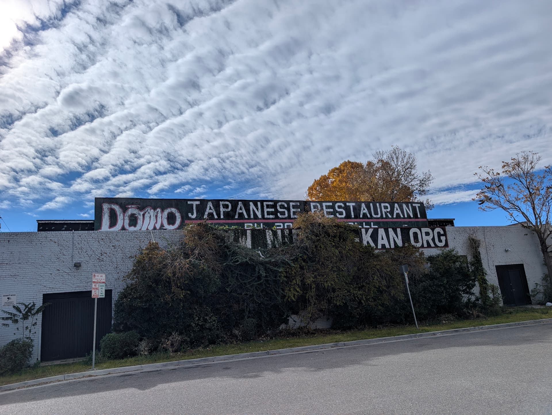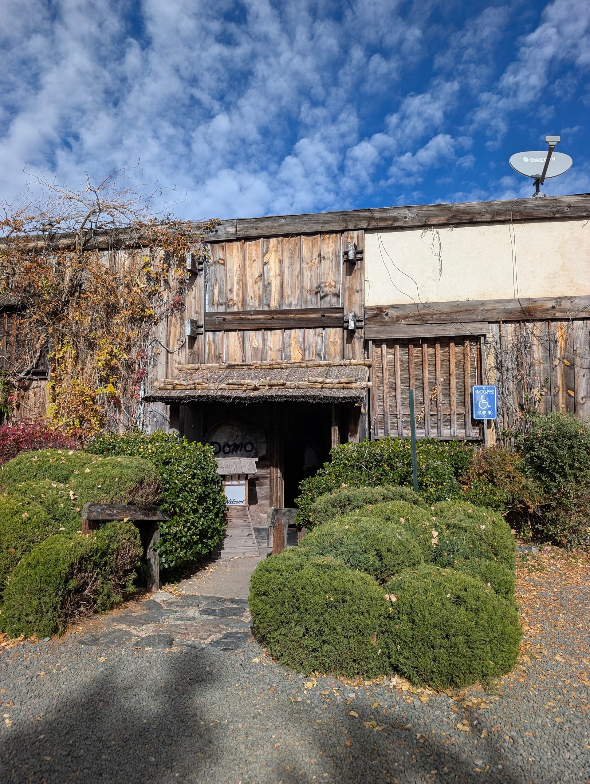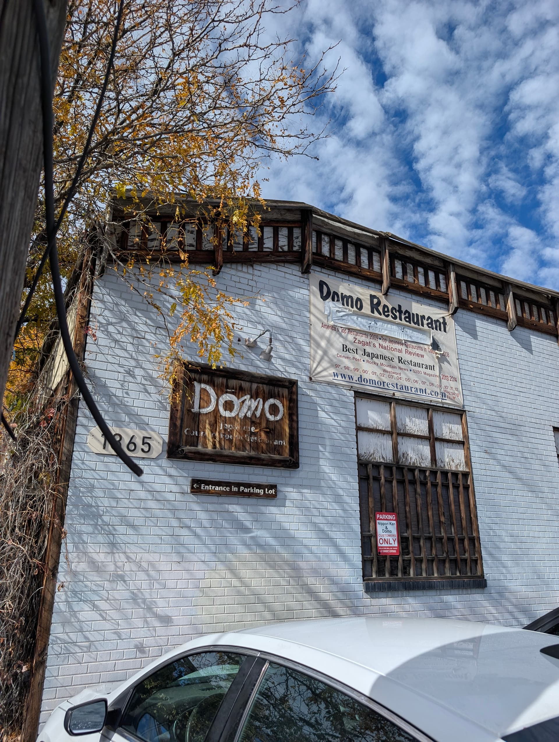 Domo Japanese Country Foods Restaurant, as its official name is, is in the northern part of the city, converted from a disused warehouse in a former industrial area. A wide wooden sign, painted to attract the attention of passing drivers, is cracked; gravel surrounds the perimeter of the building and onto the driveway, which is decorated with a curved Japanese roof, which leads to a more rustic thatched roof over the restaurant’s entrance.