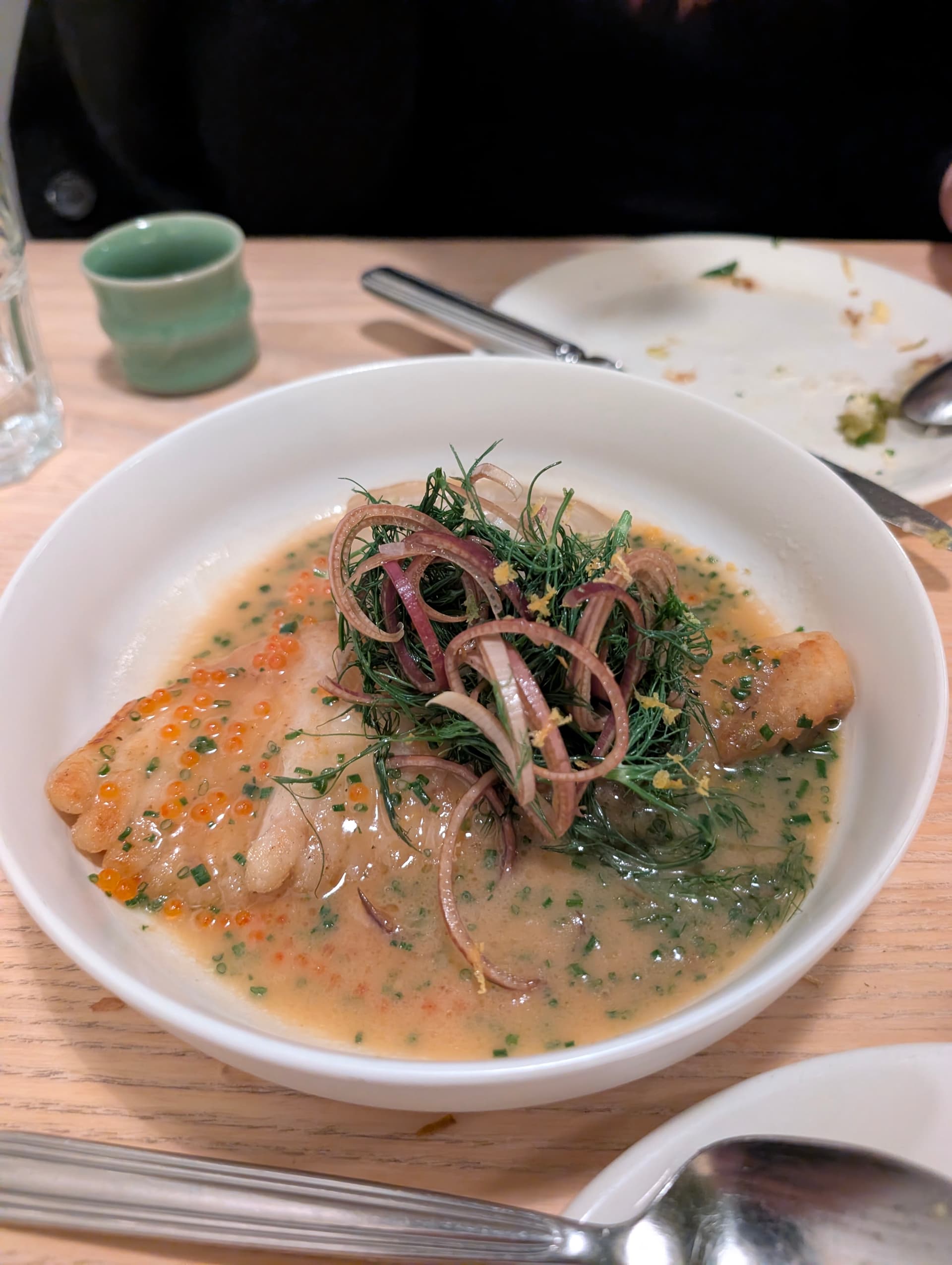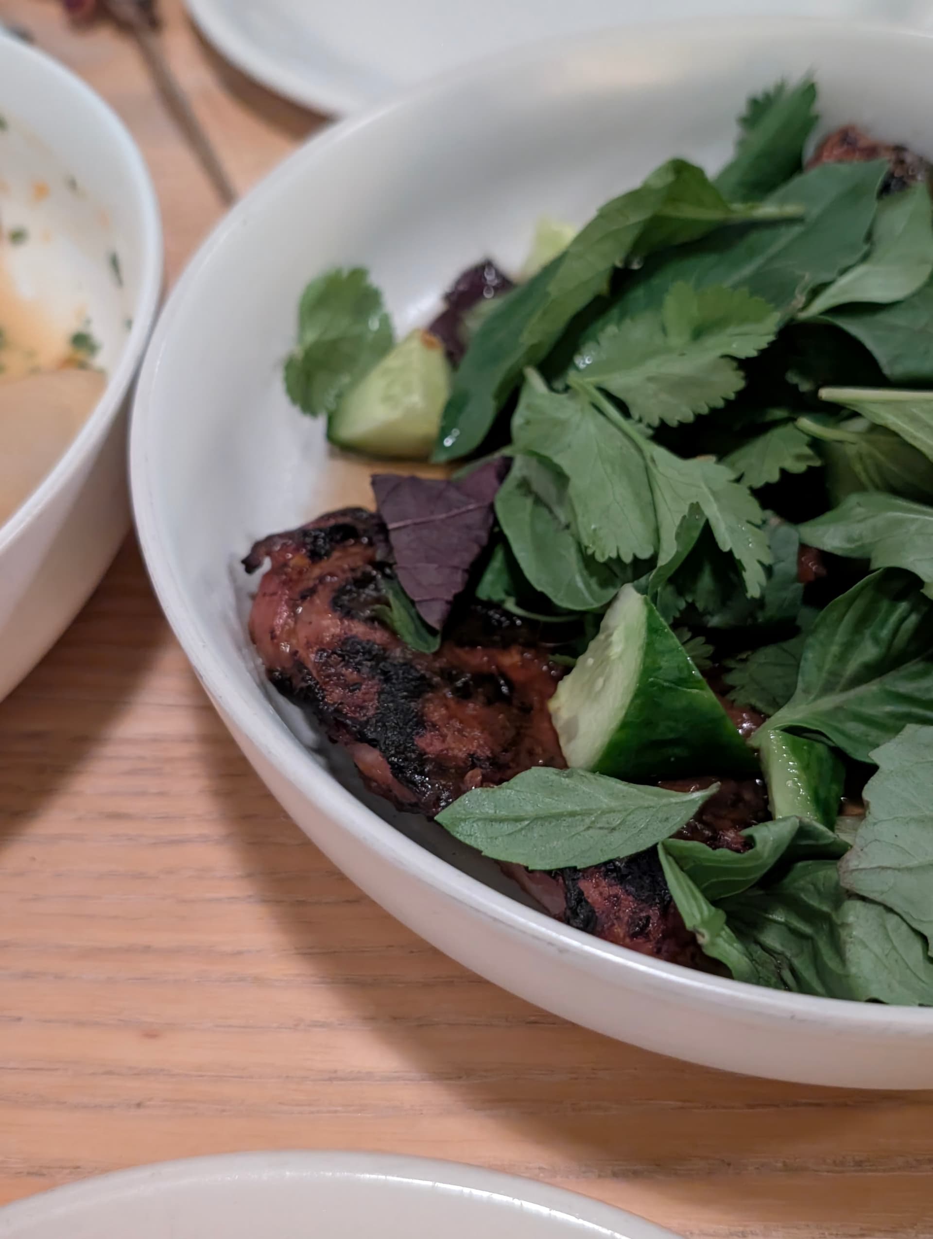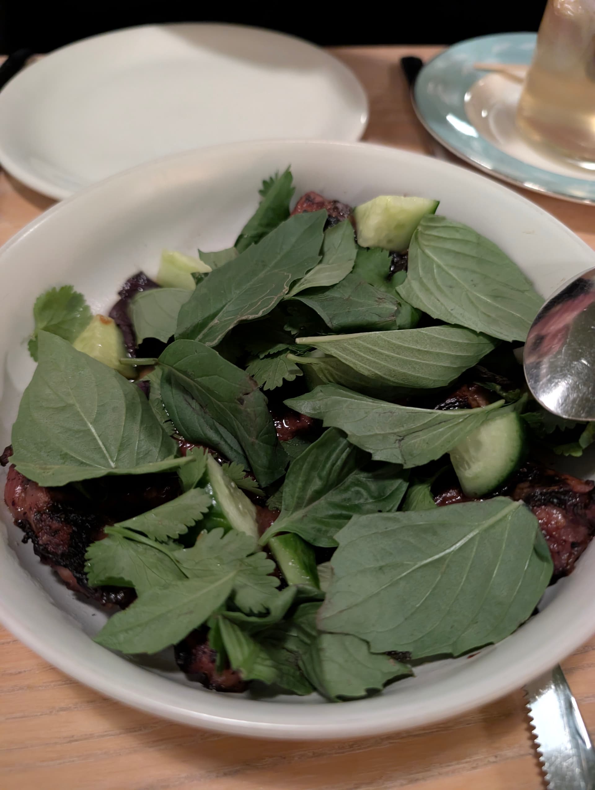 grilled pork shoulder, lemongrass, tamarind, herbs. Top one of the evening. This achieved the kind of balance we were looking for: When met with the deep and salty soy, the tamarind sweetens and boosts, all lightened by the fresh herbs. The 2nd of 2 more straight forward Vietnamese preparations. I imagined this on top of rice, rice noodles… Now that I’m looking at the picture, would have liked to have seen the pork shoulder pieces more, but this was delicious