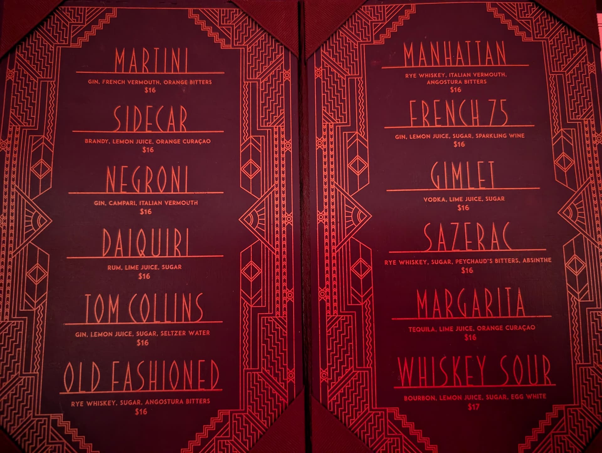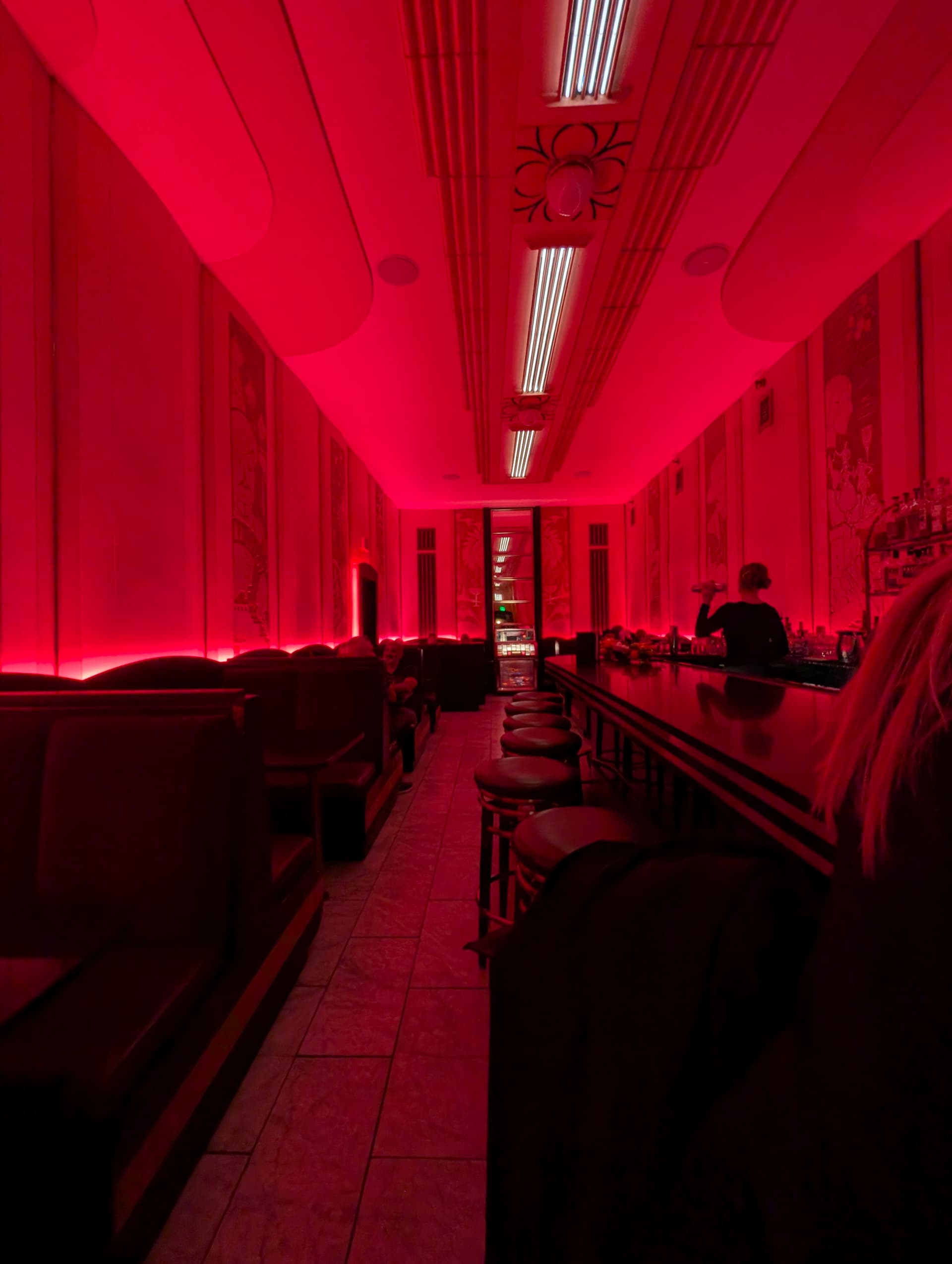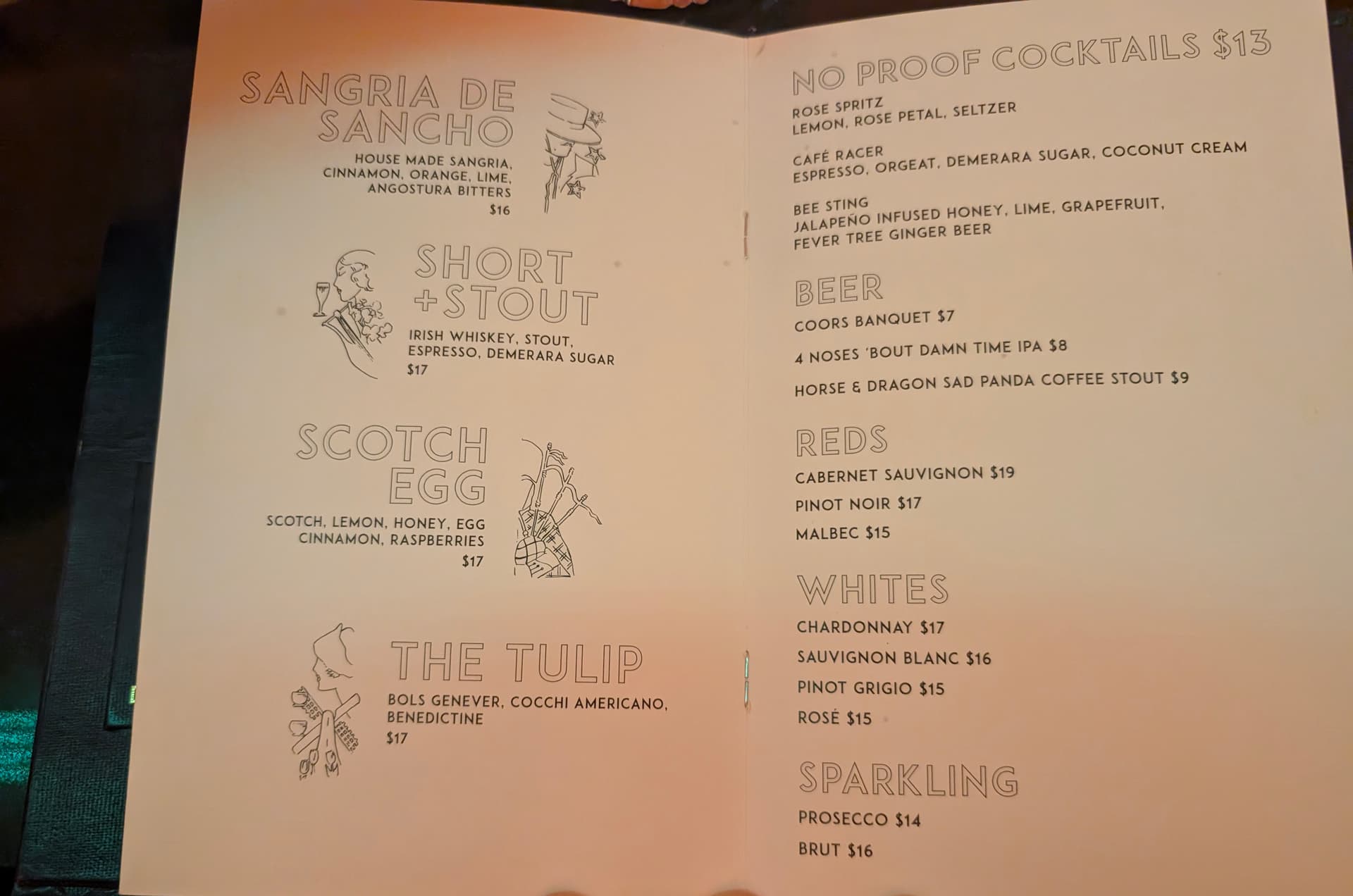 Napped. Then, we made ourselves presentable for drinks at The C[r]uise Room before dinner at Sap Sua. Great Art Deco bar in Lower Downtown with a great cocktail program. The space was designed by the same person who did one of the lounges on the Queen Mary. There are a handful of N/A drinks, though we didn’t try them.