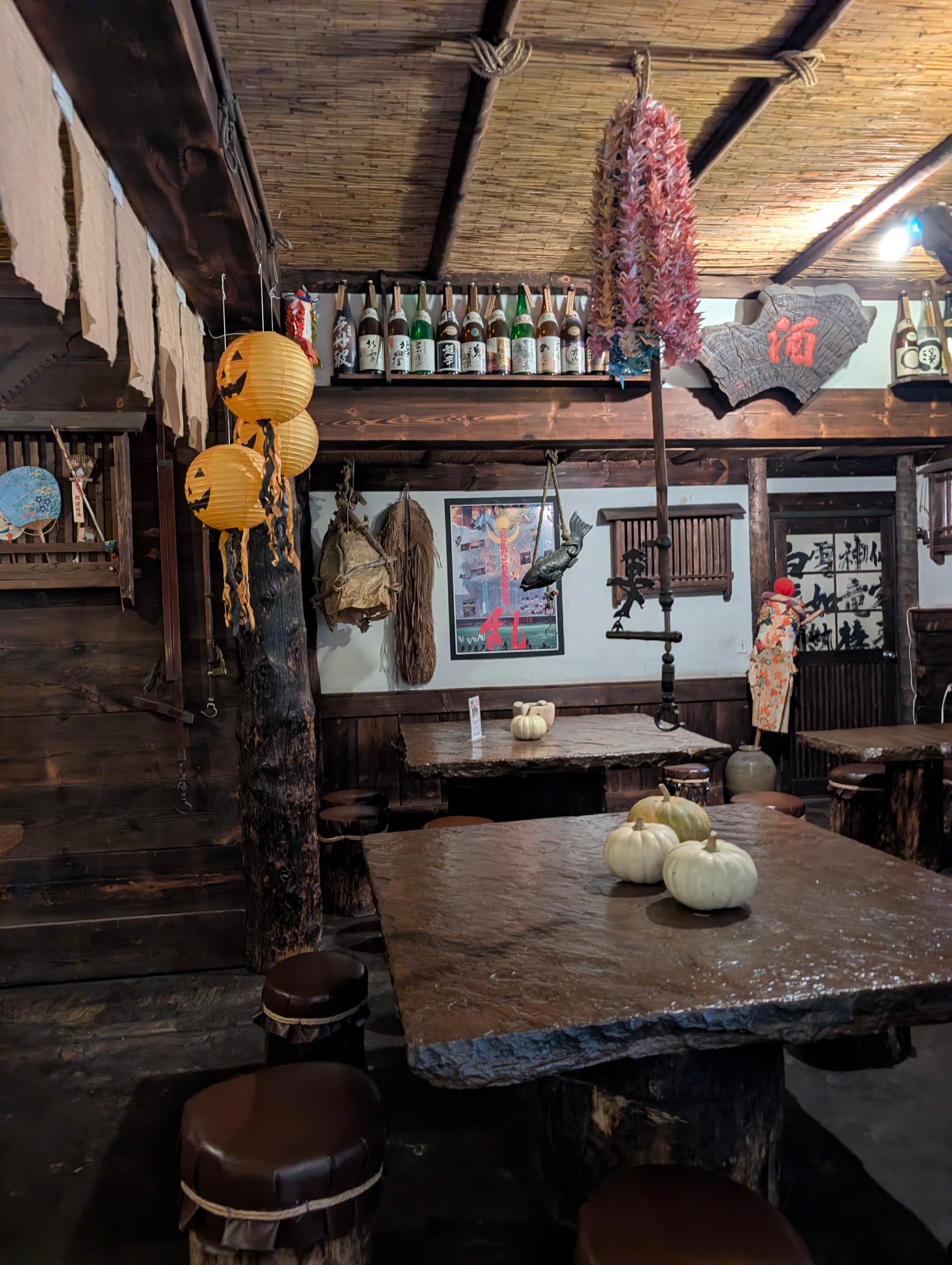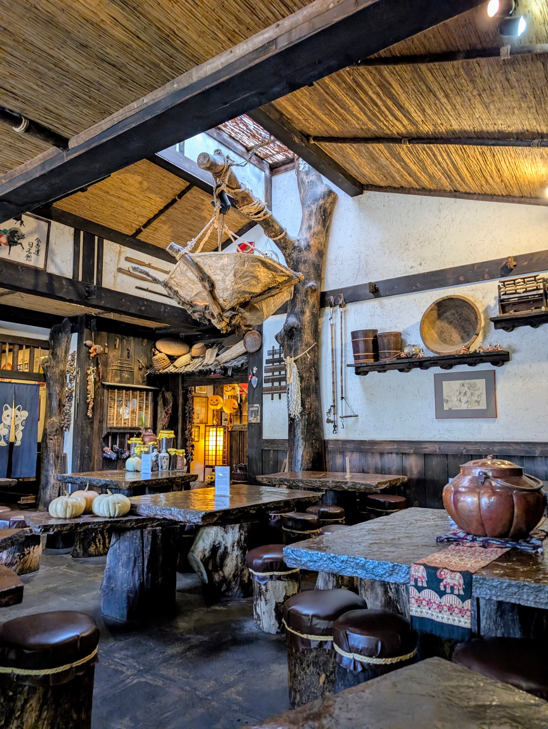 The interior is dark, with slabs of stone set atop tree stumps for tables. It does indeed feel like a period drama, or a Samurai movie in the mold of Zatoichi.