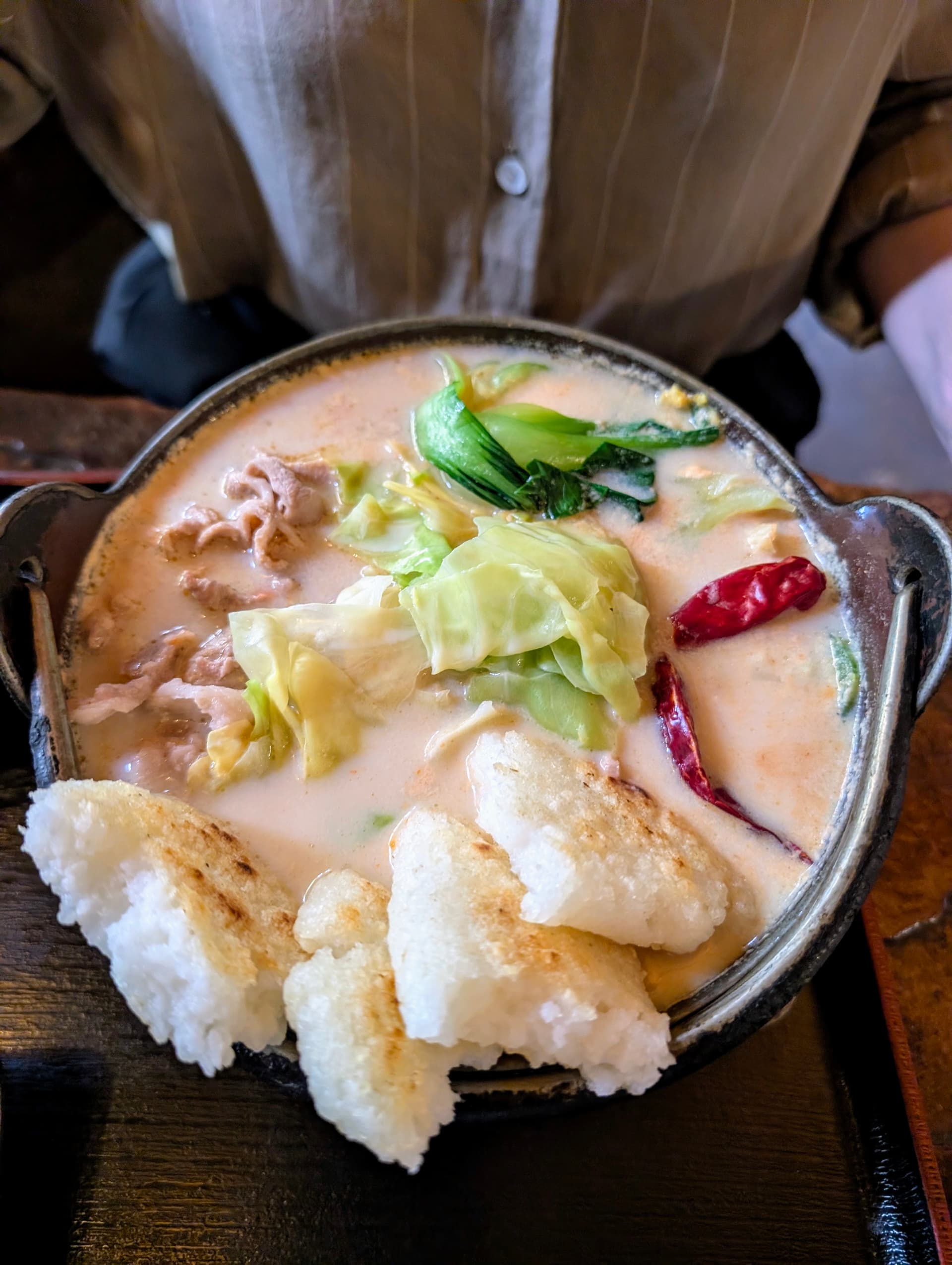 As evinced by its name, Domo serves “country” foods; in its various interpretations, this means accessible favorites (katsu and curry dons), familiar staples (soba and udon), and, the draw for us, two of Homma-san’s Akita specialties: Kiritanpo nabe and Gattsuri Okoge. The menu describes the former as a specialty from Akita, and comes with three broth options: miso dashi, soy dashi, and spicy soy milk, recommending to choose the third. We chose the third.