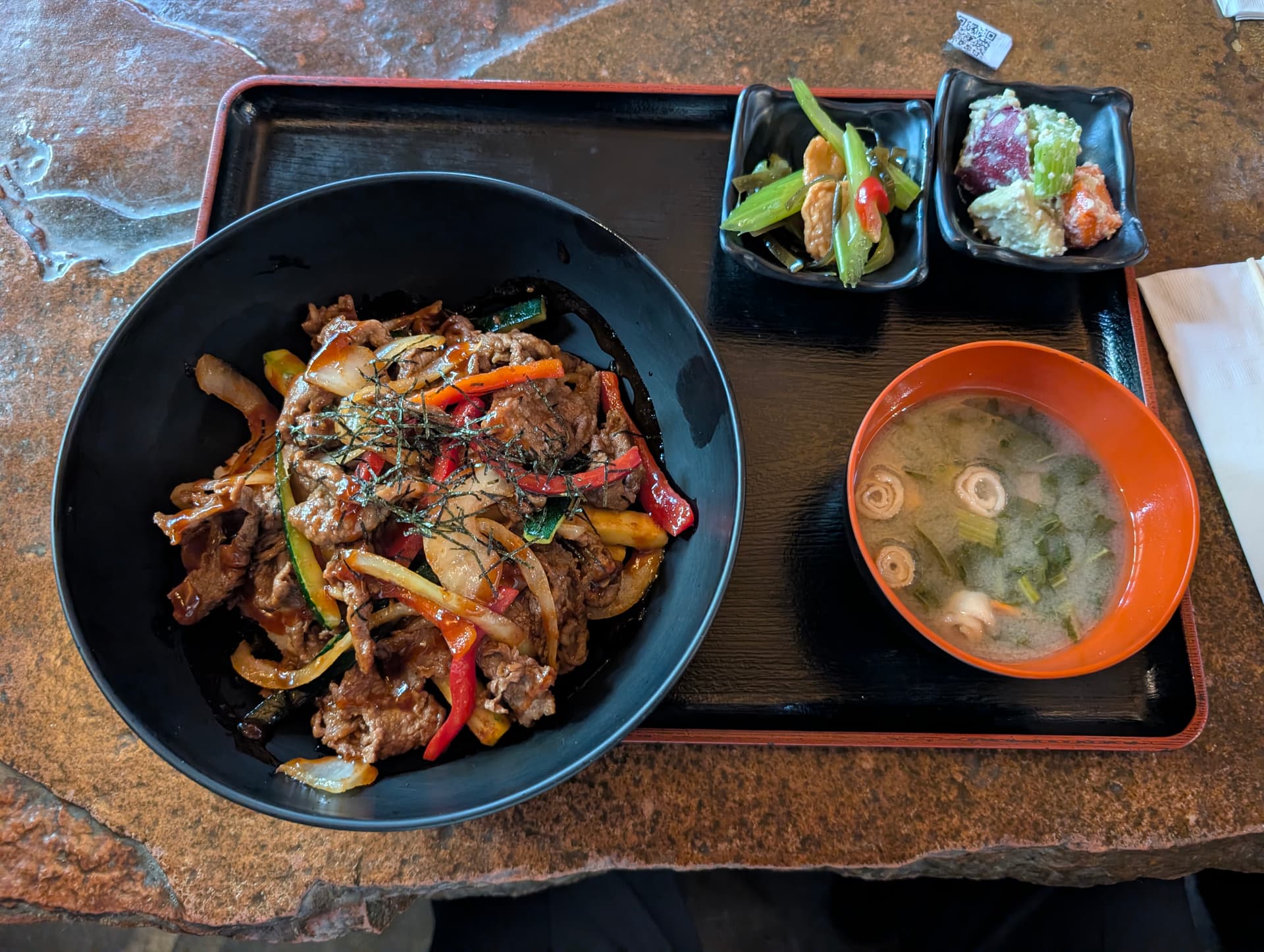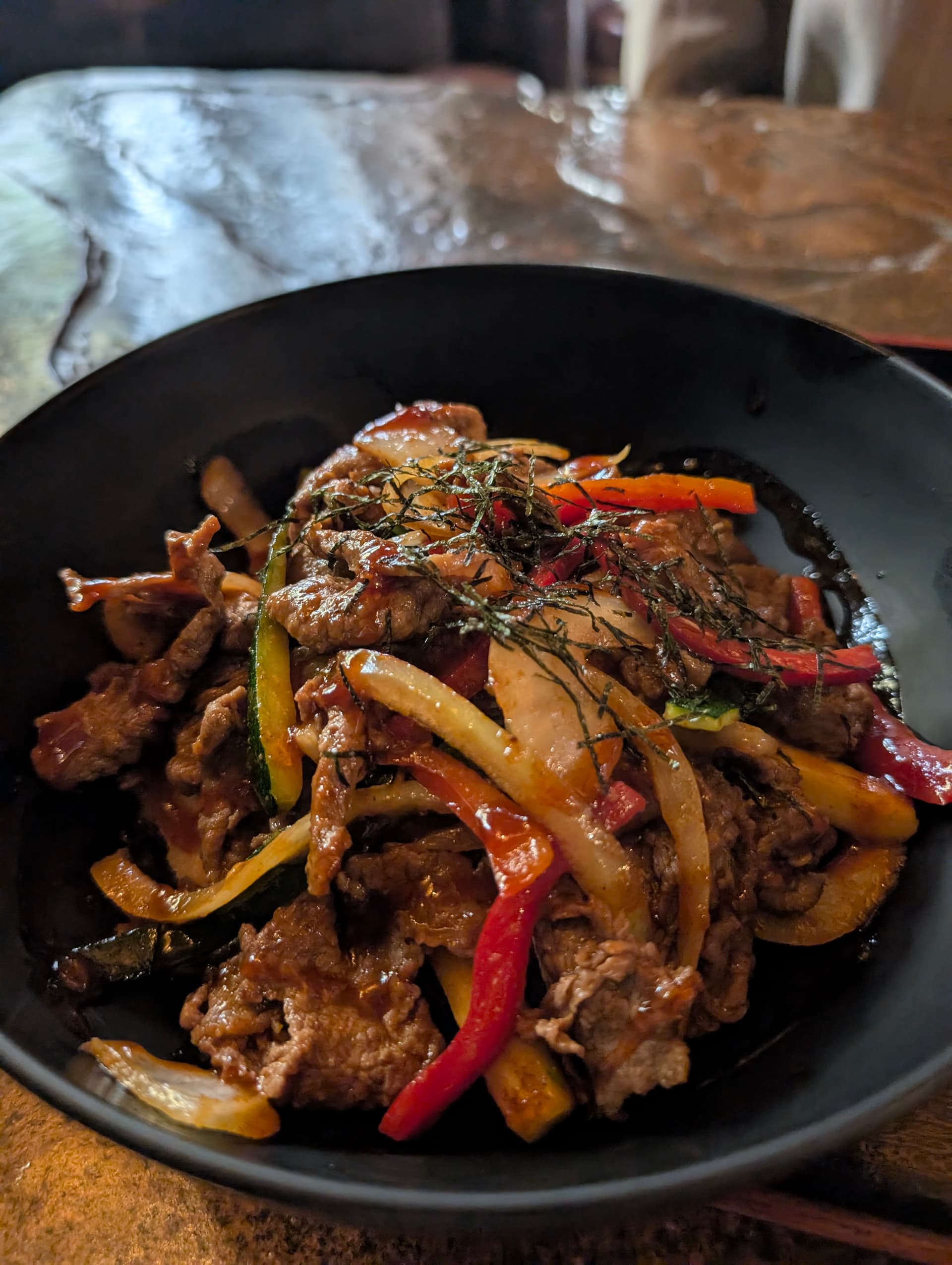 We also chose the Gattsuri Okoge, which is a spicy stir-fry of squash, peppers, and a protein (in my case, beef), on top of okoge, cooked rice that’s been molded and baked to replicate the flavor of crusty rice from a stone pot.