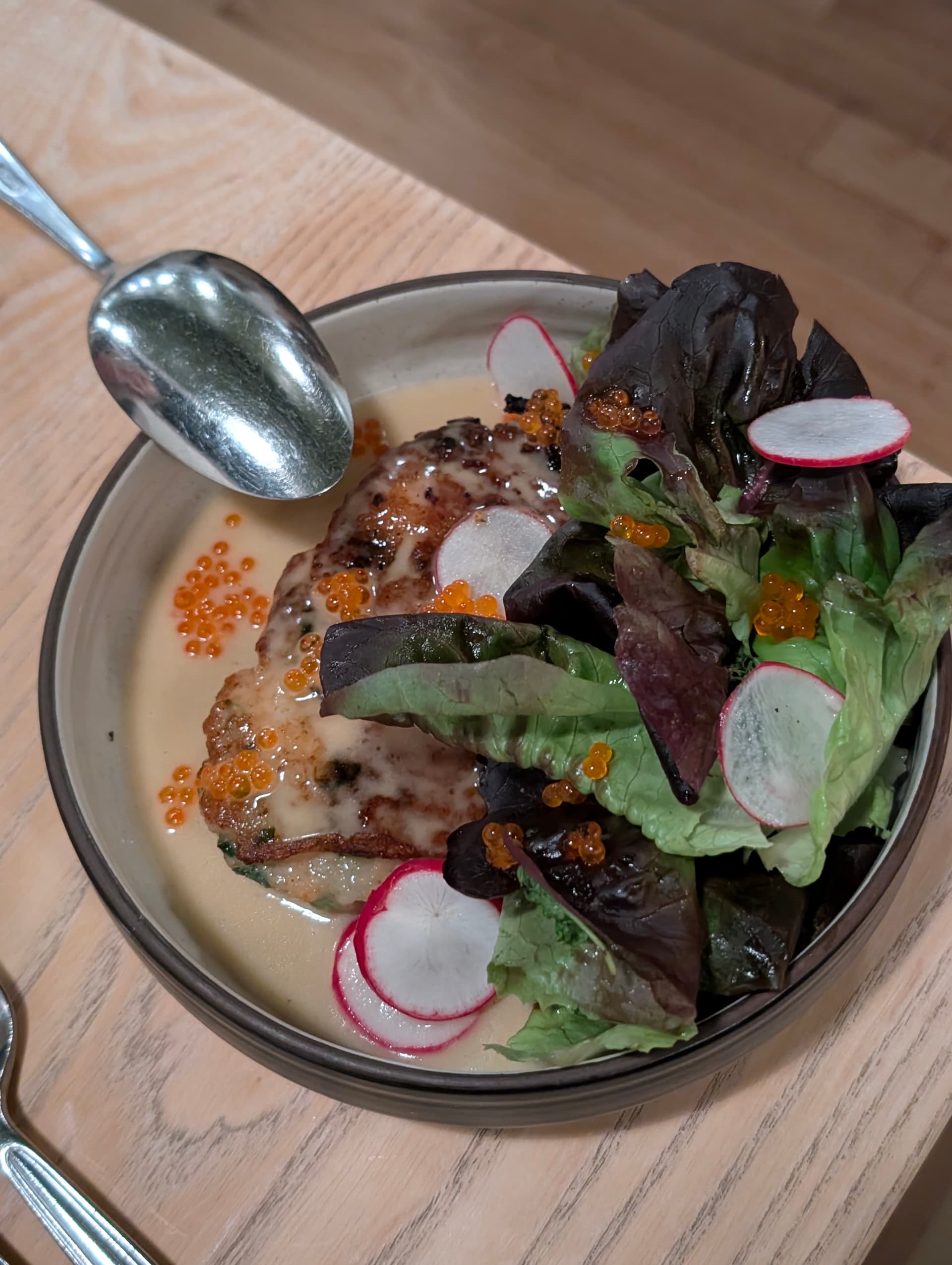 (shrimp cake, beurre blanc, trout roe, mint. All hand-minced shrimp, obviously, with the occasional nugget of a bigger piece. Usually not a big fan of shrimp, but the cake had great texture. The beurre blanc, though, was too heavy, and overwhelmed the whole dish; it seemed thirsty for a bright lift. The two beurre blanc-based dishes, in the mix of the other stout dishes, was too much for us. More on this below.