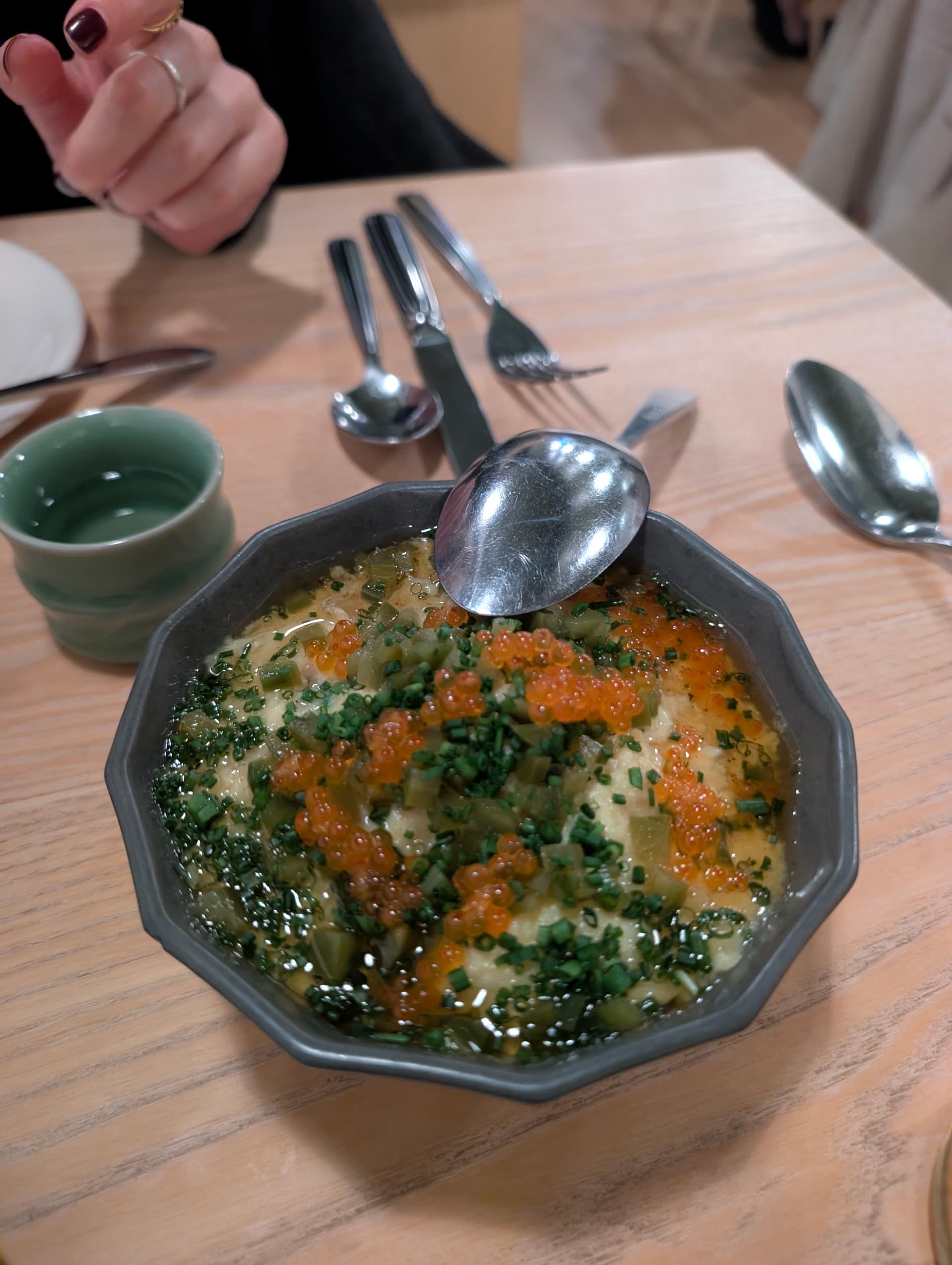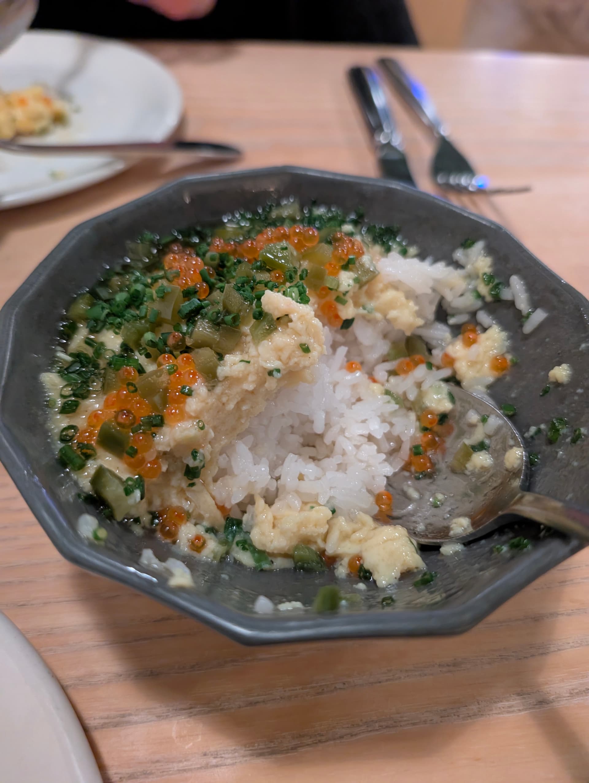 (soft scrambled egg, brown butter, fish sauce, trout roe, rice. A level above custard and remiscent of its source material, this was 1 of the 2 more straightforward Vietnamese preparations of our order. I went back and back for the trout roe. Though it was one of three dishes that featured a butter/roe sauce that began our erroneous ordering strategy.)
