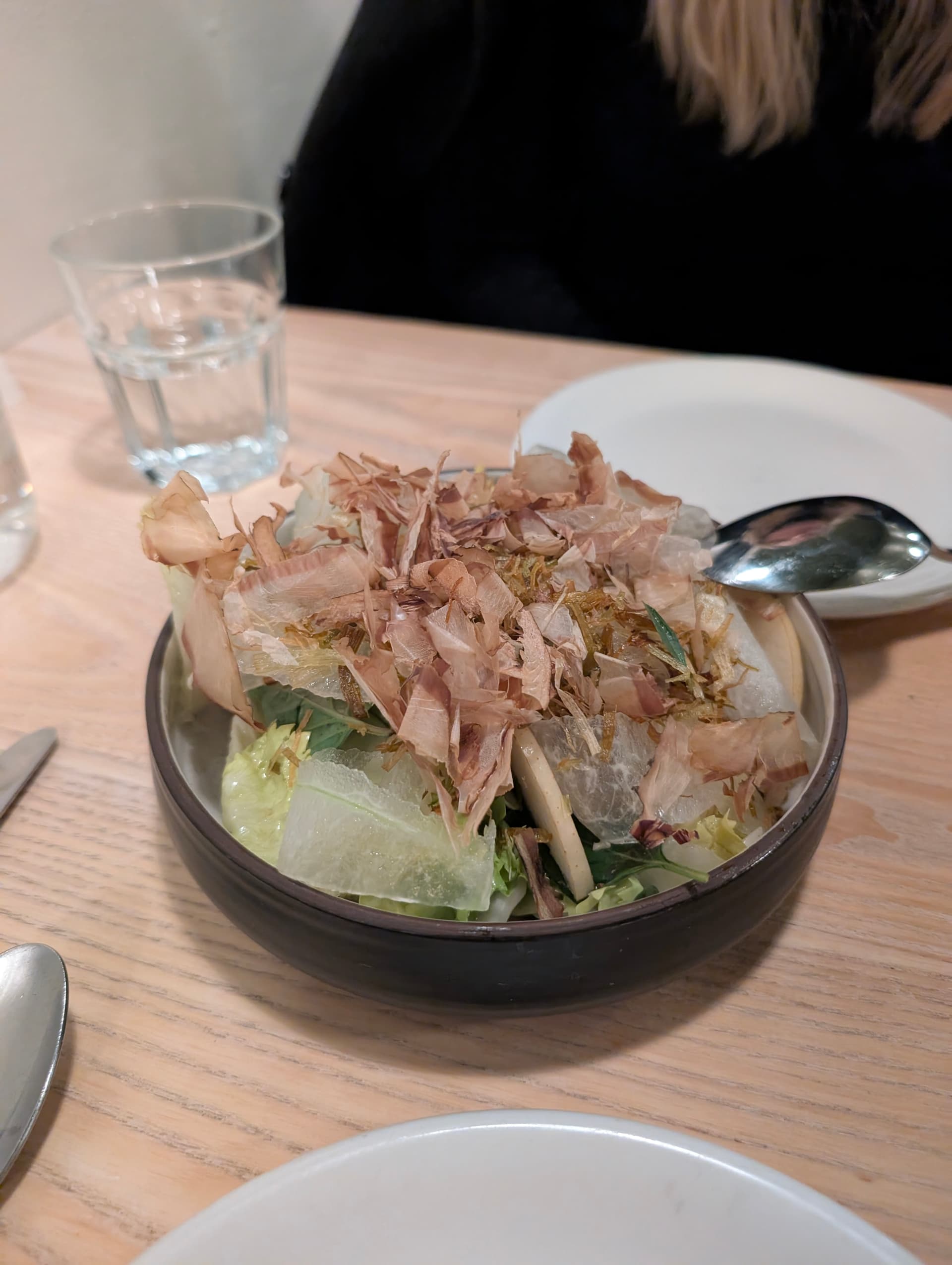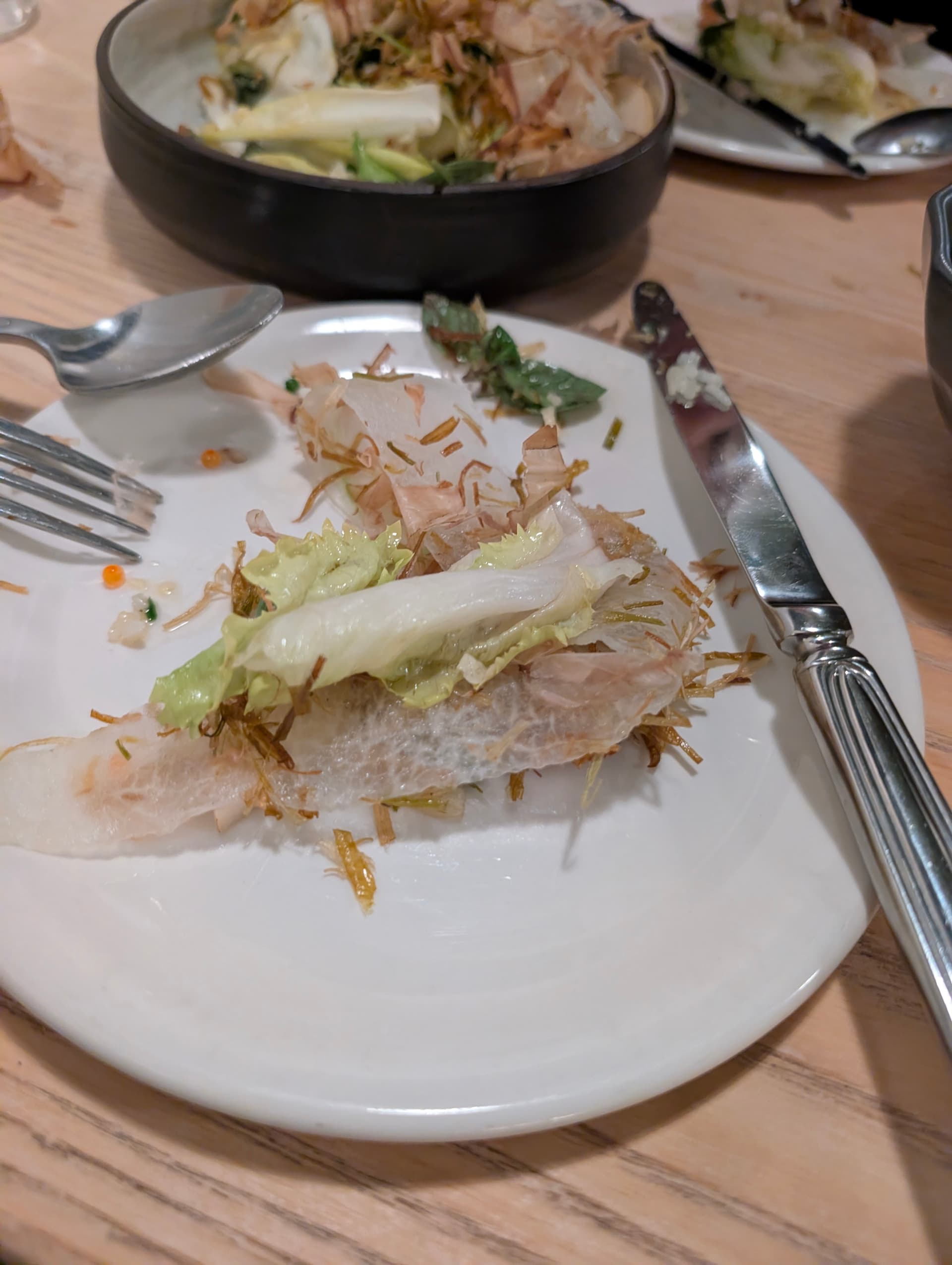 (endive salad, winter melon, pear, cane sugar vinaigrette. Not listed on the menu are bonito flakes and fish sauce. Very good salad incorporating Asian-favored fruits and western vegetables/templates. The mild winter melon and pear played nicely with the endive; the salad overall was a welcome and tasty counterpoint to the rice. The dressing had 1-2 tsp’s too many of fish sauce, which overwhelmed the acid on the vinaigrette.)