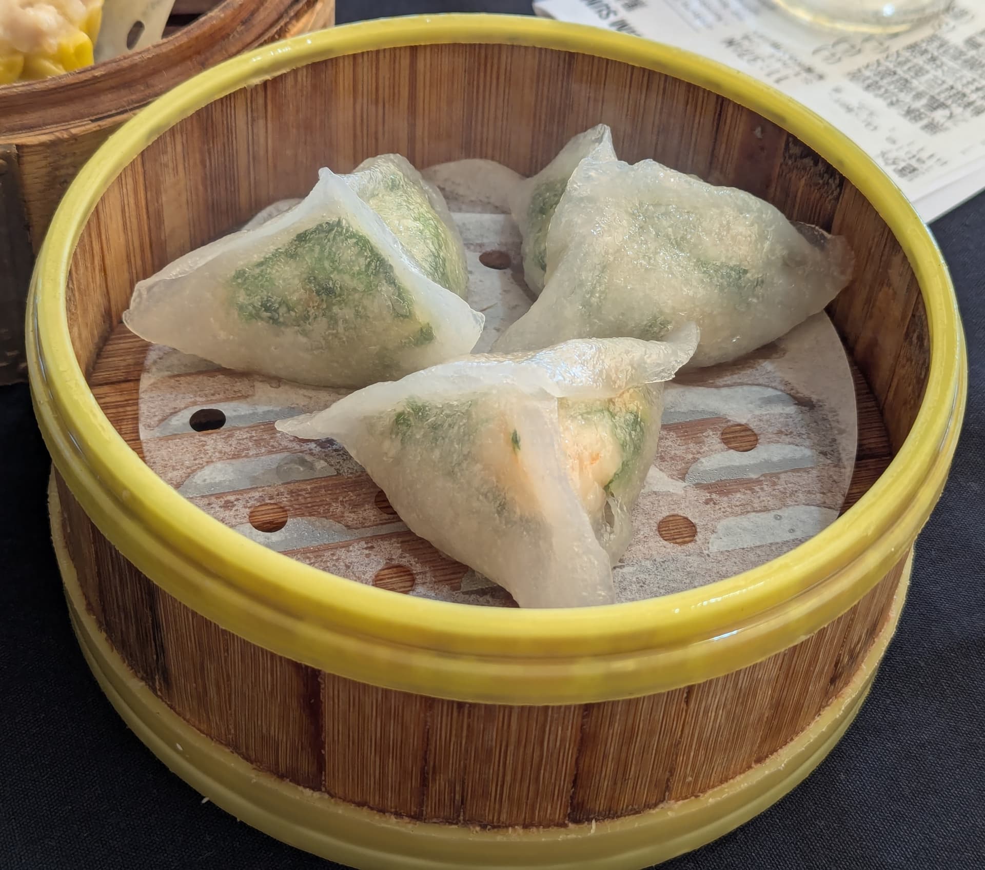 Shrimp and pea shoot: really good but stuck to the paper and steamer.