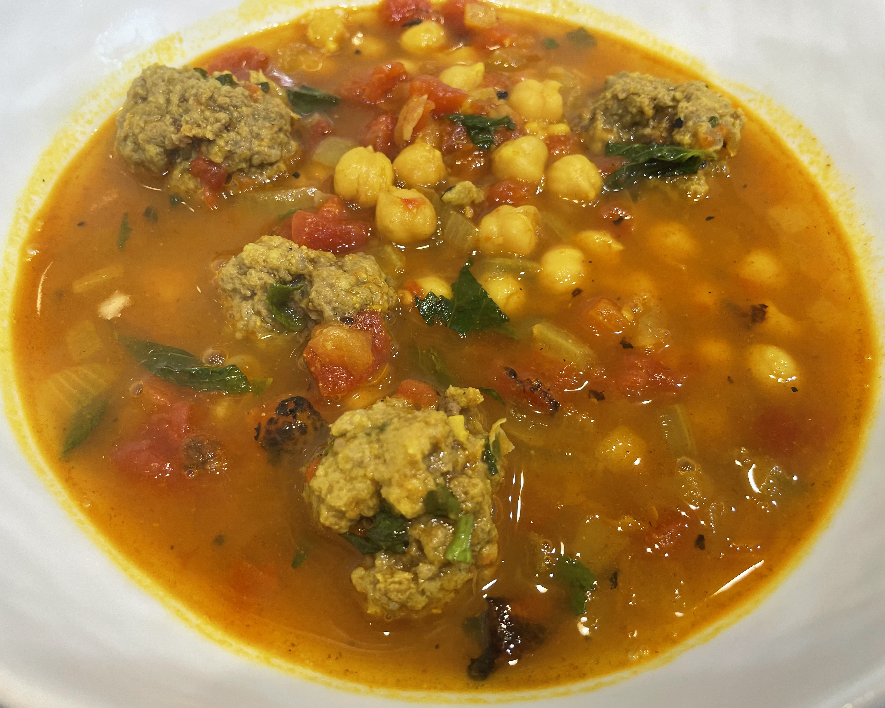 Variation on Libyan sharba - meatballs (ground beef, soaked bread, fresh mint), chickpeas (quarter of it mashed to give the soup some body), diced tomatoes with chilies, harissa, cumin, turmeric and fresh mint cooked in chicken broth