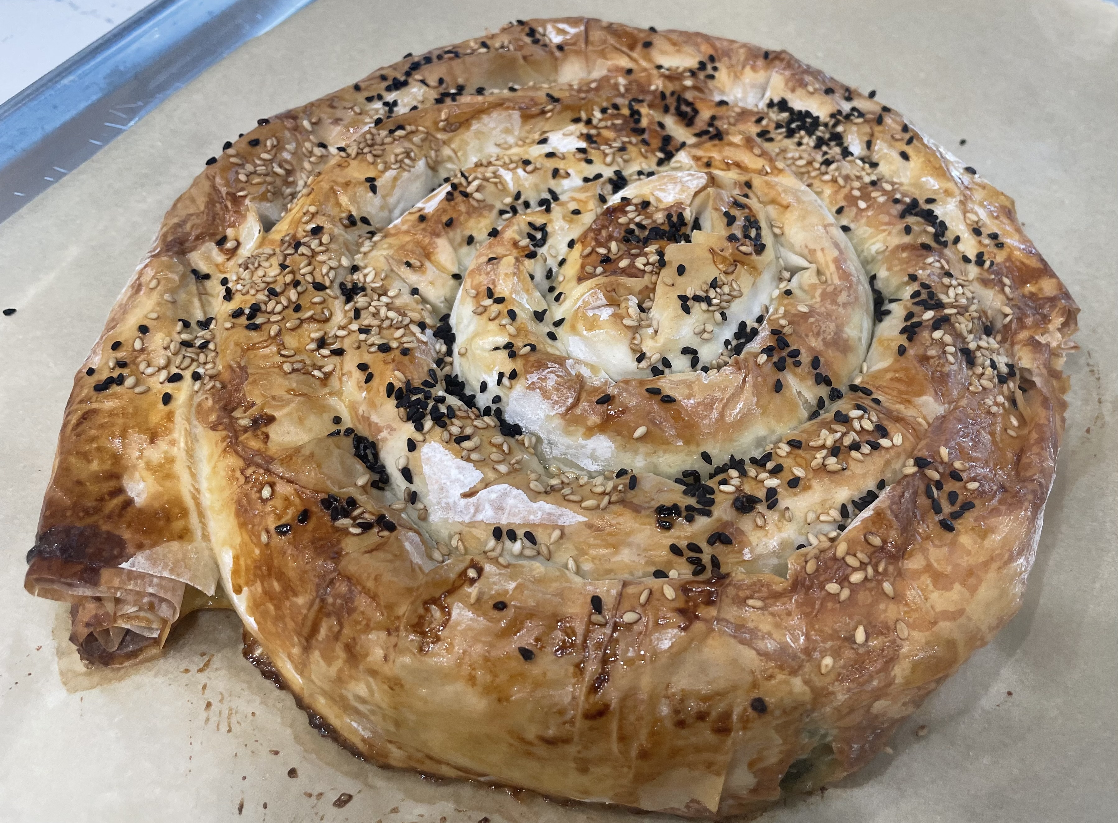 Turkish inspired dinner with borek - phyllo dough filled with spinach, onion and feta. Topped with a mixture of egg, oil and milk and some sesame and nigella seeds.