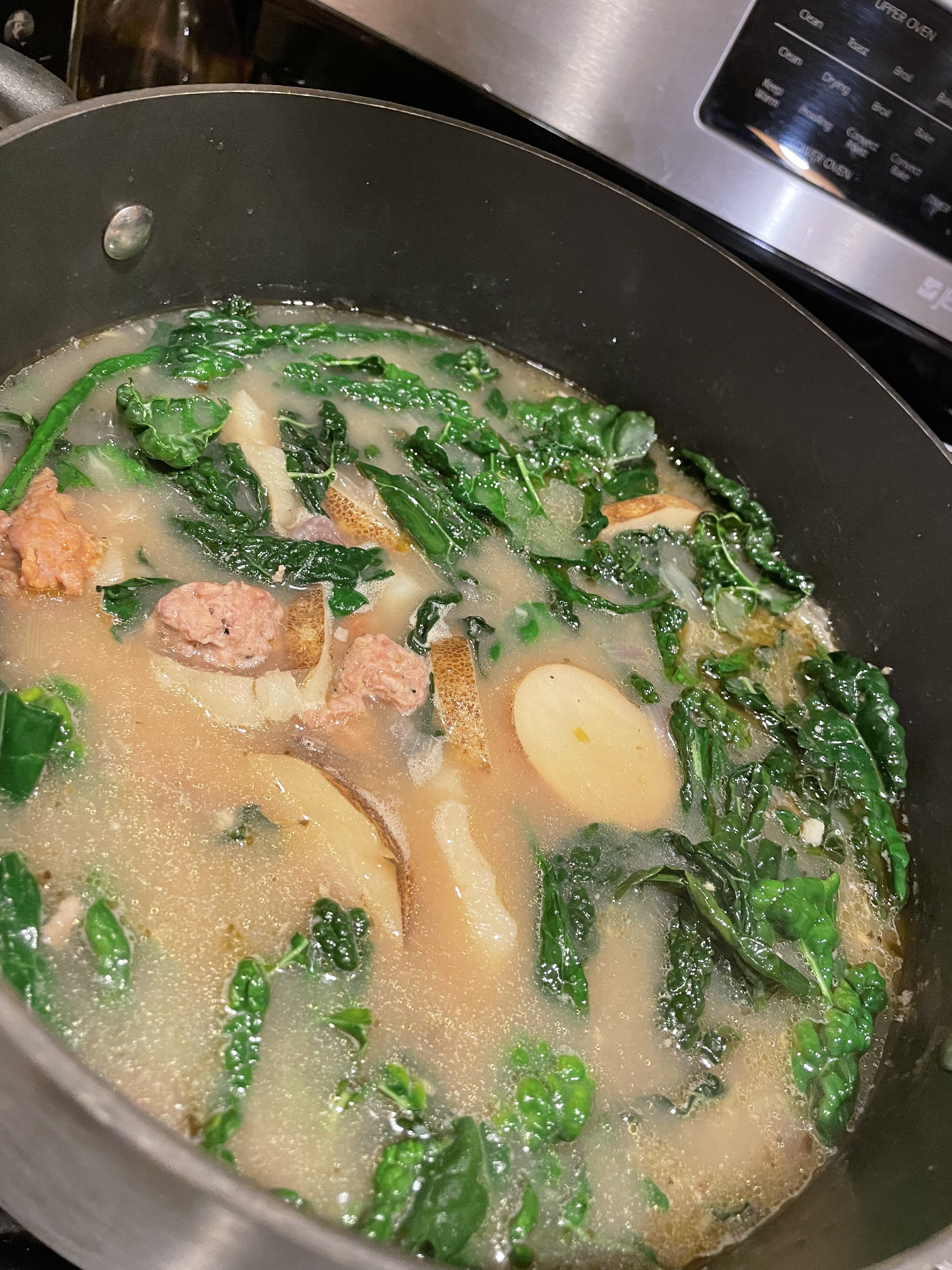 Cold weather requires stew - Black-eyed pea stew with andouille sausage, bacon, kale, celery, leeks, green pepper, onion, garlic, jalapeno, chili flakes, bay leaves and chicken broth. Finished with some cider vinegar.