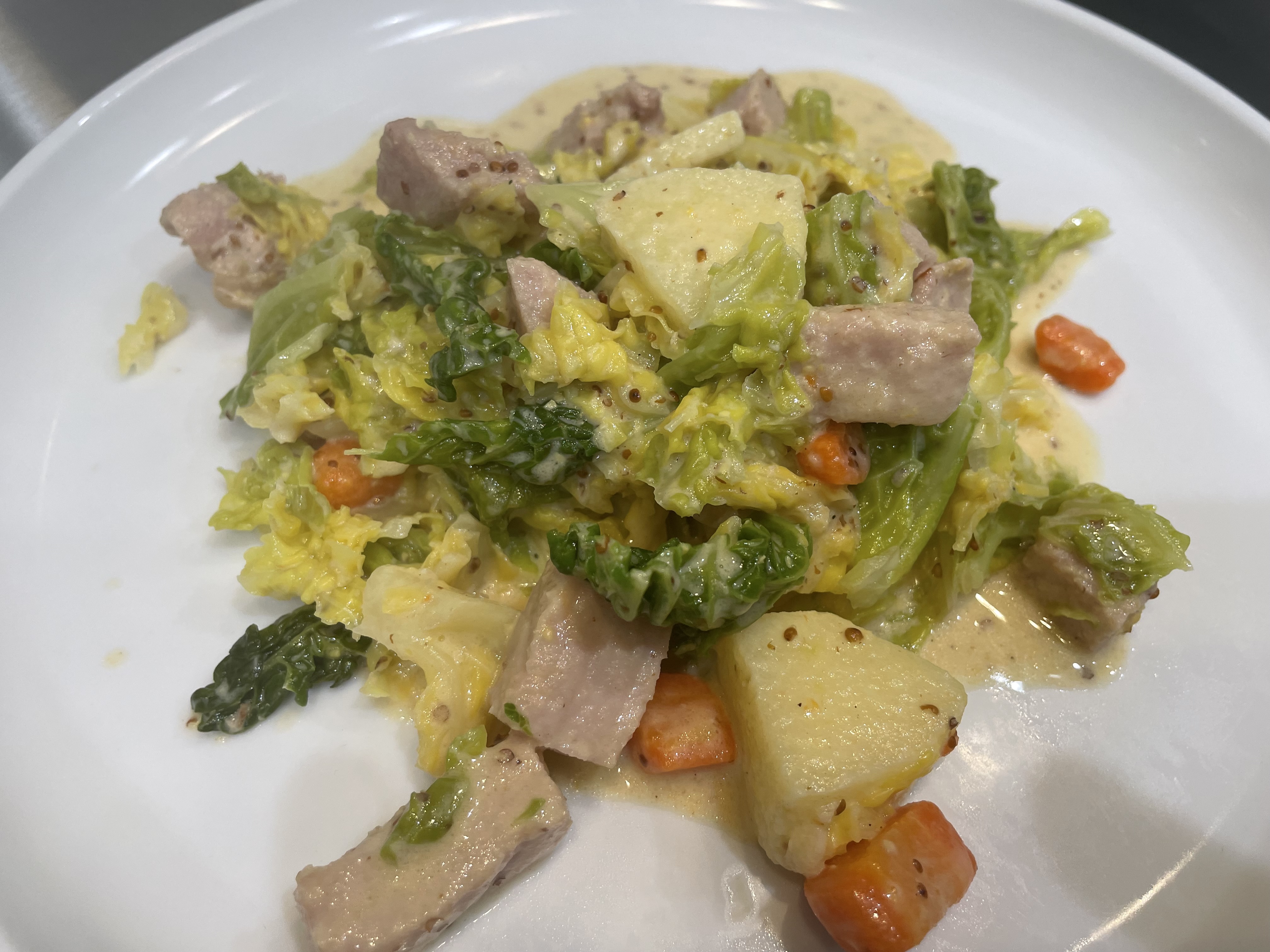 Very German dinner with kassler (smoked pork chop), carrots, savoy cabbage, and apple in a cream mustard sauce