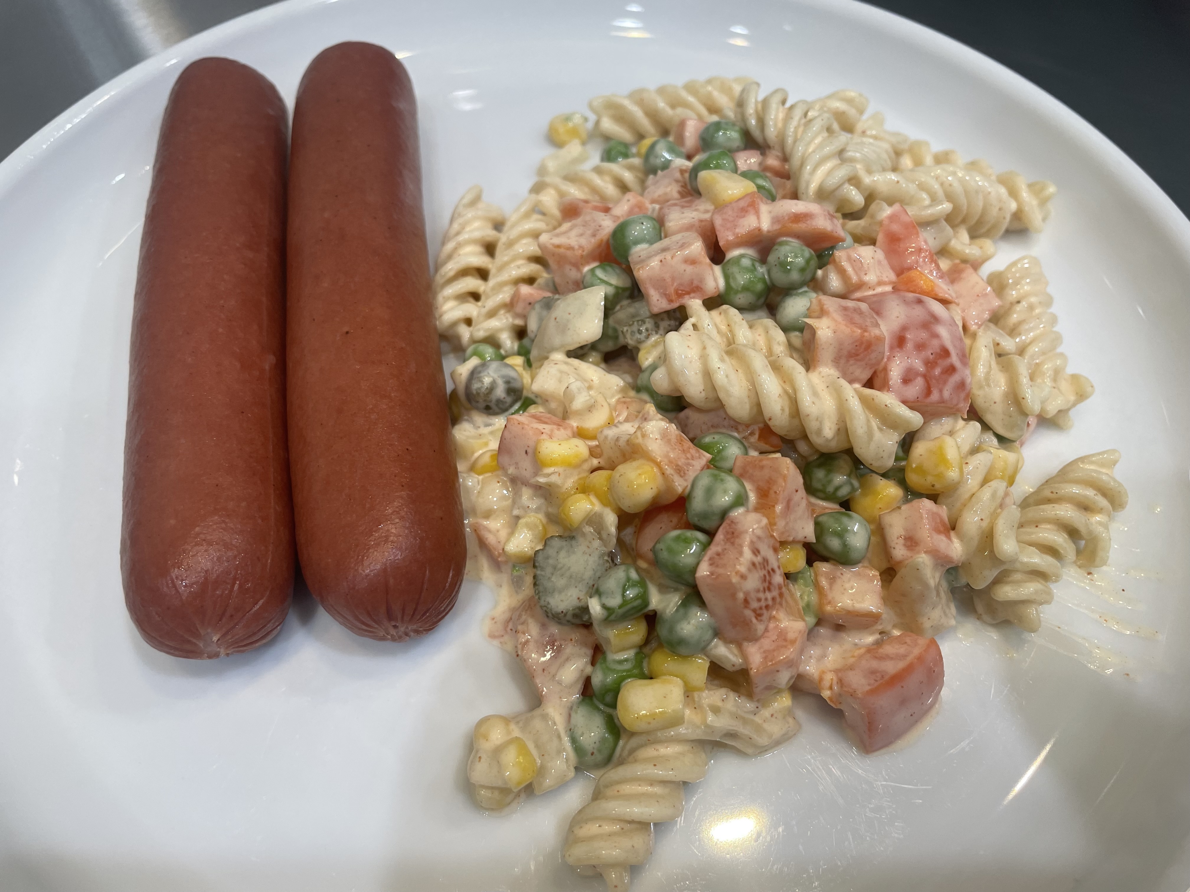 Pasta Salad - unlimited number of recipes available. This one lets you sauté onions, red pepper, carrots, peas and corn before briefly cooking them in vegetable broth so that they start to be softer but still have some bite. Mix with pasta and the sauce made from mayonnaise, sour cream, cornichons , mustard, white wine vinegar, paprika and just a pinch of curry powder.