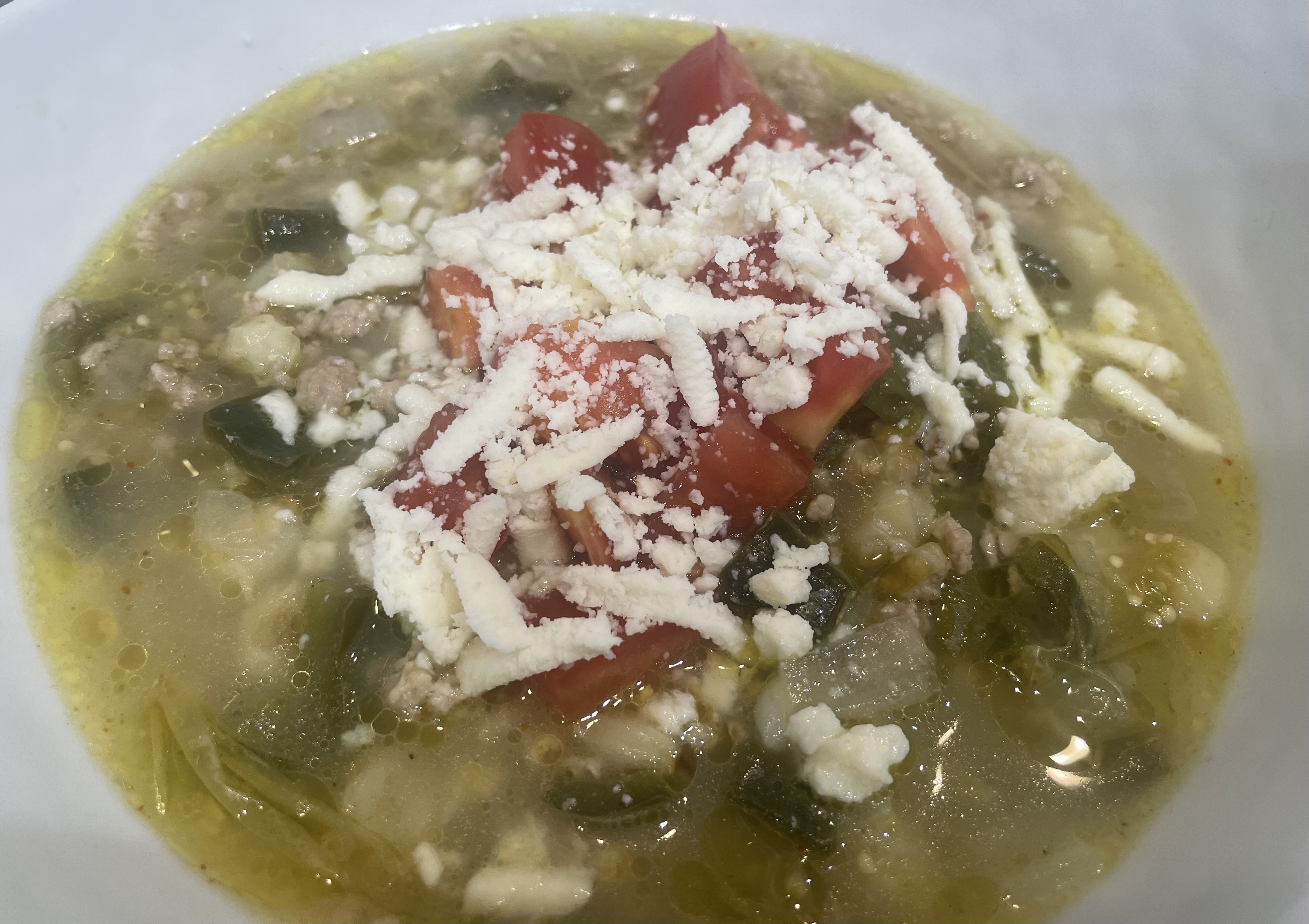 Simplified version of Green Pozole with ground pork, hominy, tomatillos, jalapeno, poblano, onion, garlic, cumin and sirararkhong chili - topped with tomatoes and queso fresco