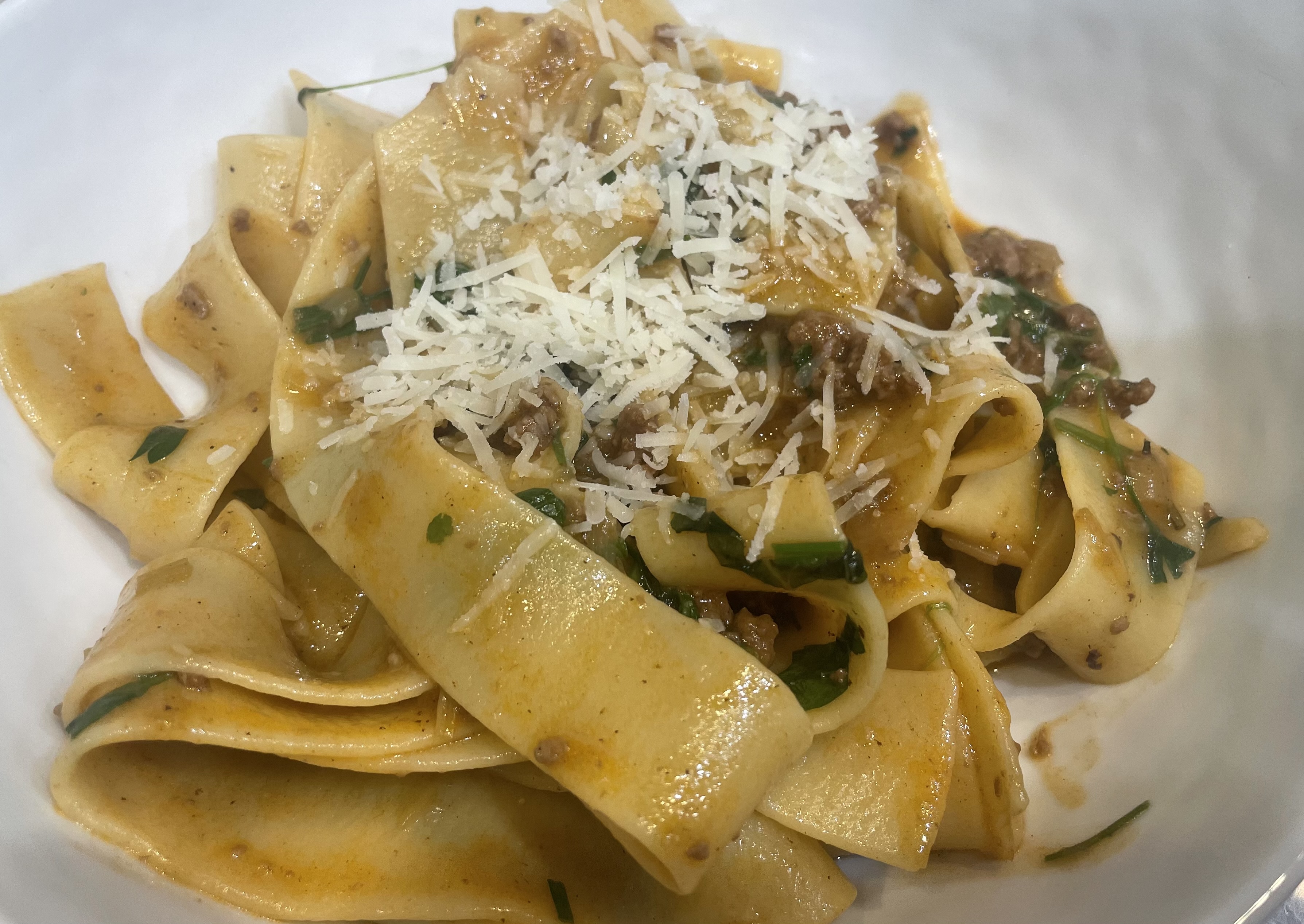 Lamb ragu with pappardelle - ground lamb with leeks, micro arugula, parsley, mint, rosemary, chives, garlic, anchovies, tomato paste, lemon zest and juice, white wine and chicken broth. Topped with some pecorino.