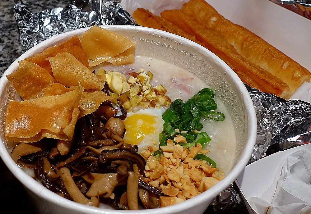 Congee with ham, mushroom, runny egg, scallion, peanut, wonton skin crisp, and yeotiao (supplemental)⌠This anchored everything. Solid, solid juk-ology. Even the pickles were bomb.