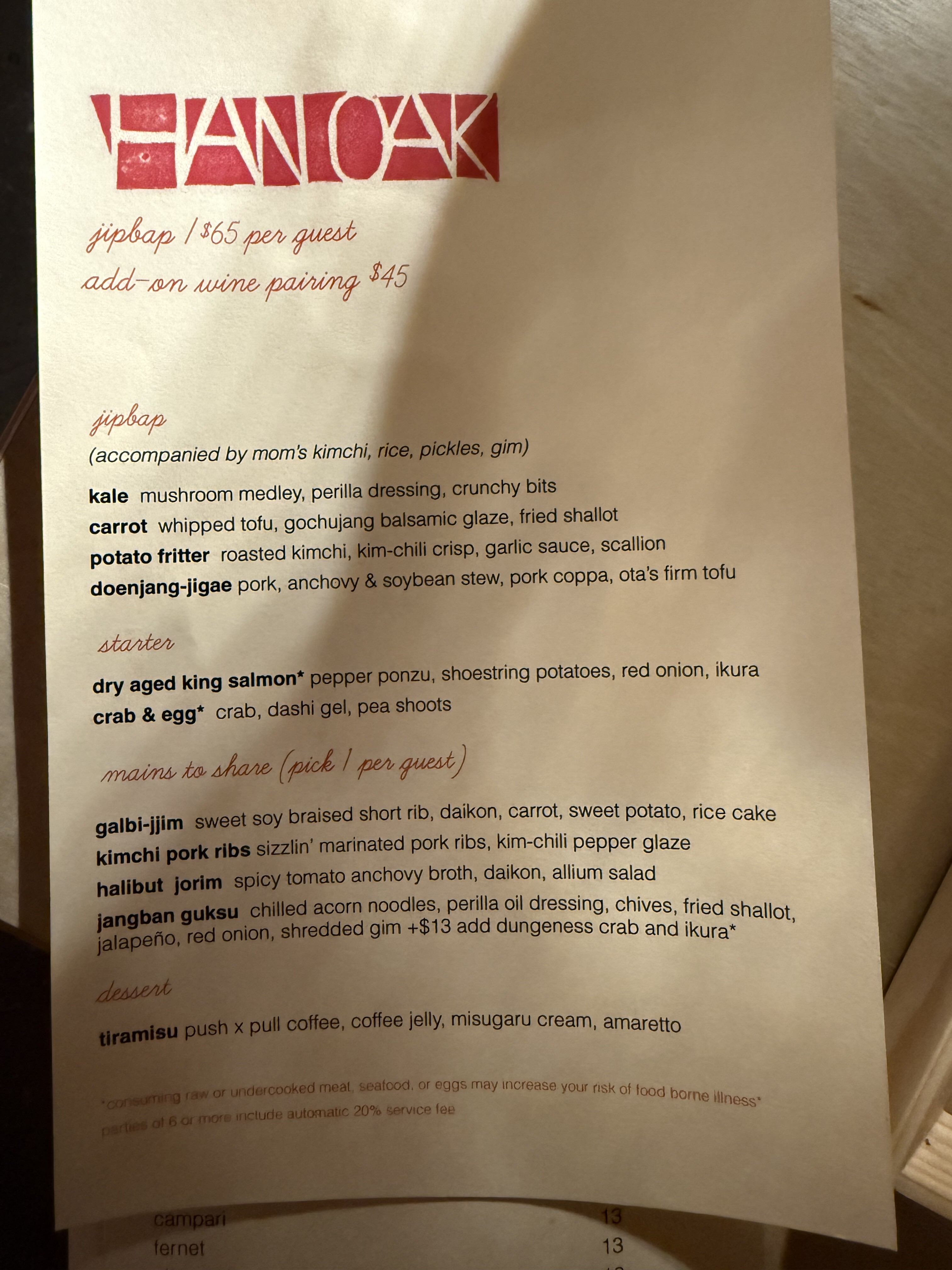 After further delay we eventually made it up to Portland and thankfully Han Oak was able to push our reservation and seat us a few hours later than intended. I’ve been wanting to eat there for years and damn did it deliver. Every single savory dish that hit the table was somewhere between great and excellent. The only subpar dish was the tiramisu dessert, but we were stuffed by then so it was fine. We opted for the galbi jjim and acorn noodles (because I loved Yangbans version) as our mains. I’d eat at this place all the time if it were in LA. Go here if you are in Portland.