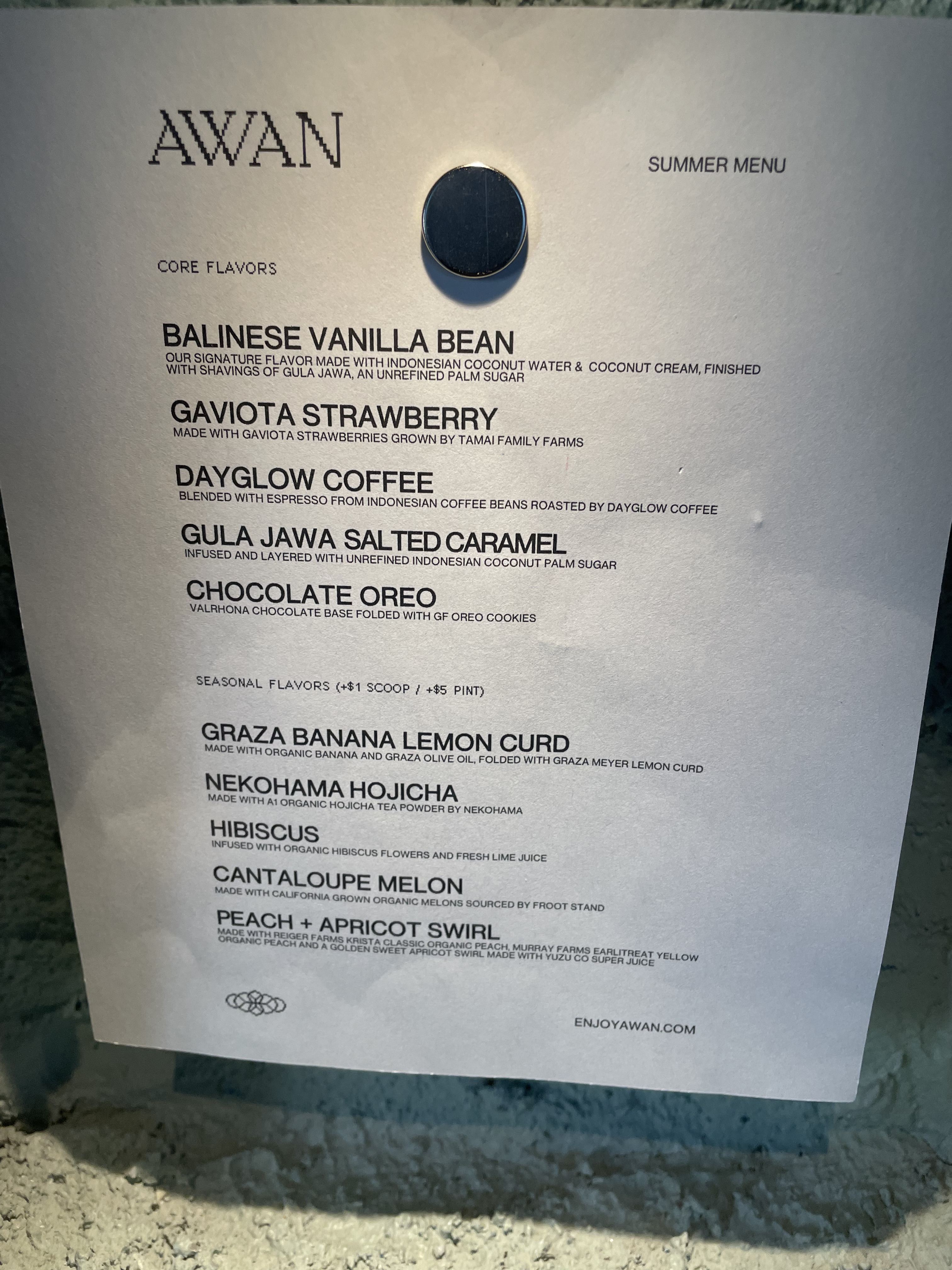 Quick stop at the newish Awan on Rose in Venice. The flavors are incredible-- dense, vivid and almost un-ice cream-like; ‘transcendent’ comes to mind, but I’m not sure I want to be the kind of person who uses that word.