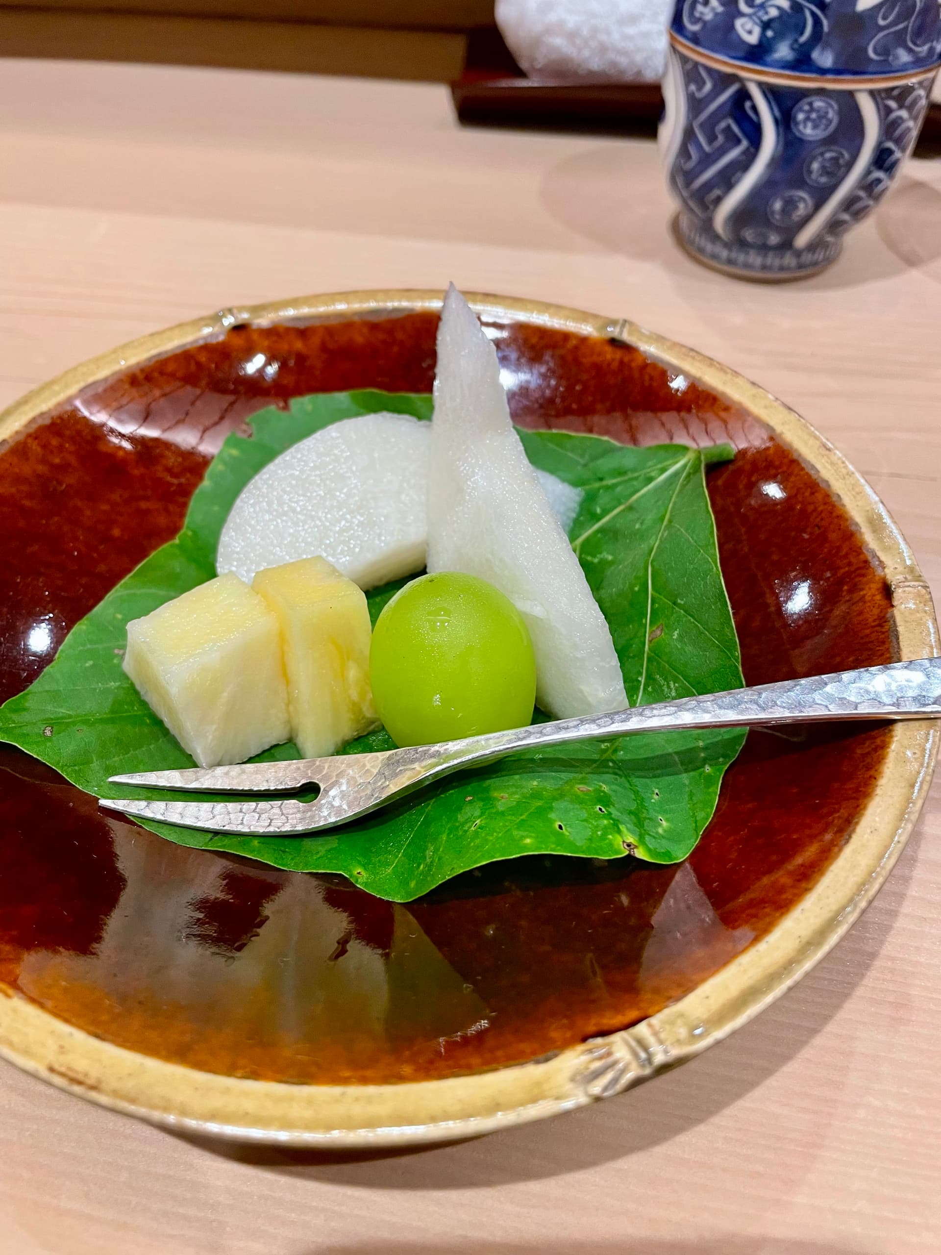 The team honored us with an anniversary Hassun platter of house specialties: whole grilled Tai, corn fritters, simmered local waygu, local sweet potato, sanma bozushi, smoked salmon, and gobo.