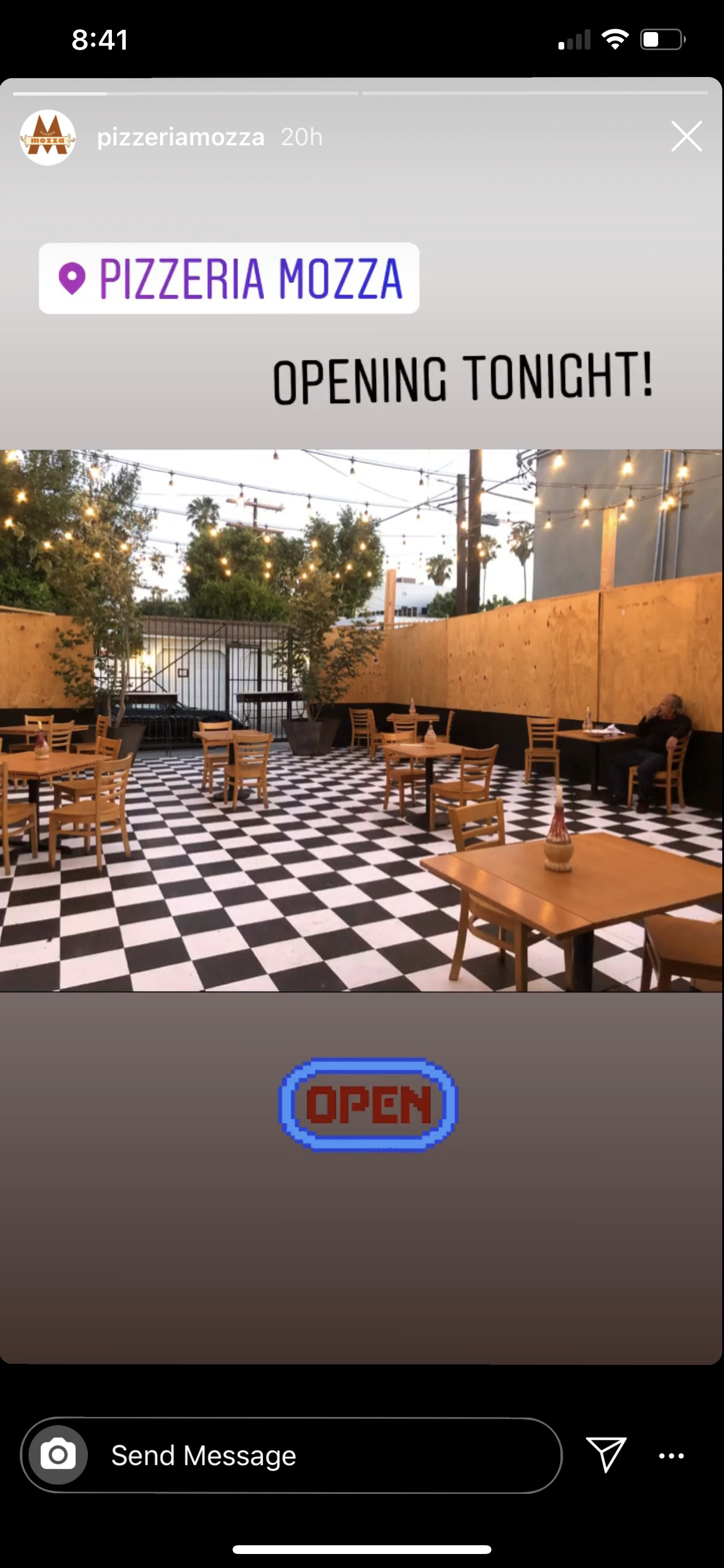 Mozzaâs Instagram shows a new patio being constructed â looks like it was their parking area? â which is a welcome change.
