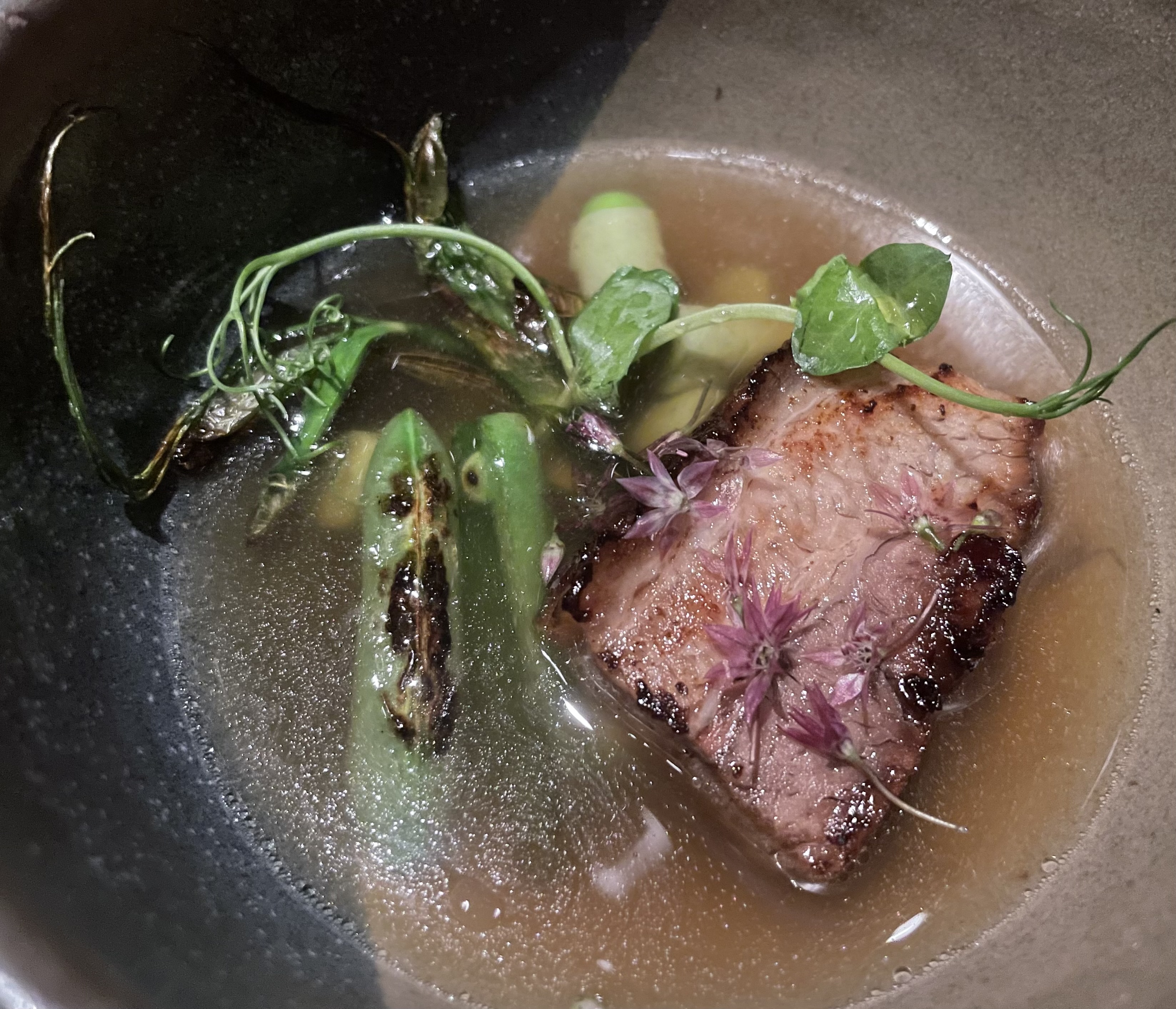 Three ways: “grilled white asparagus” (milk poached & grilled w/duck prosciutto, and green garlic aioli w/shaved duck egg on top), “white asparagus vichyoisse” (w/charred spring onion rather than leek, on an ichiban oyster), and a “sourdough bread bowl” (fermented white asparagus clam chowder, and lazy bear reserve caviar by Tsar Nicoulai)