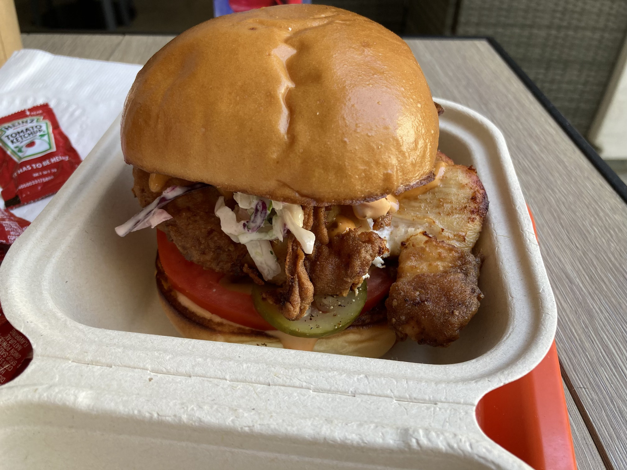 Fried chicken at Citrin’s new fast-casual place (Augie’s on Main). The place is pretty much a (high-end) shack. You order at a kiosk and then someone squeezes a rubber chicken (no, seriously) to alert you when the food is ready for pick up.