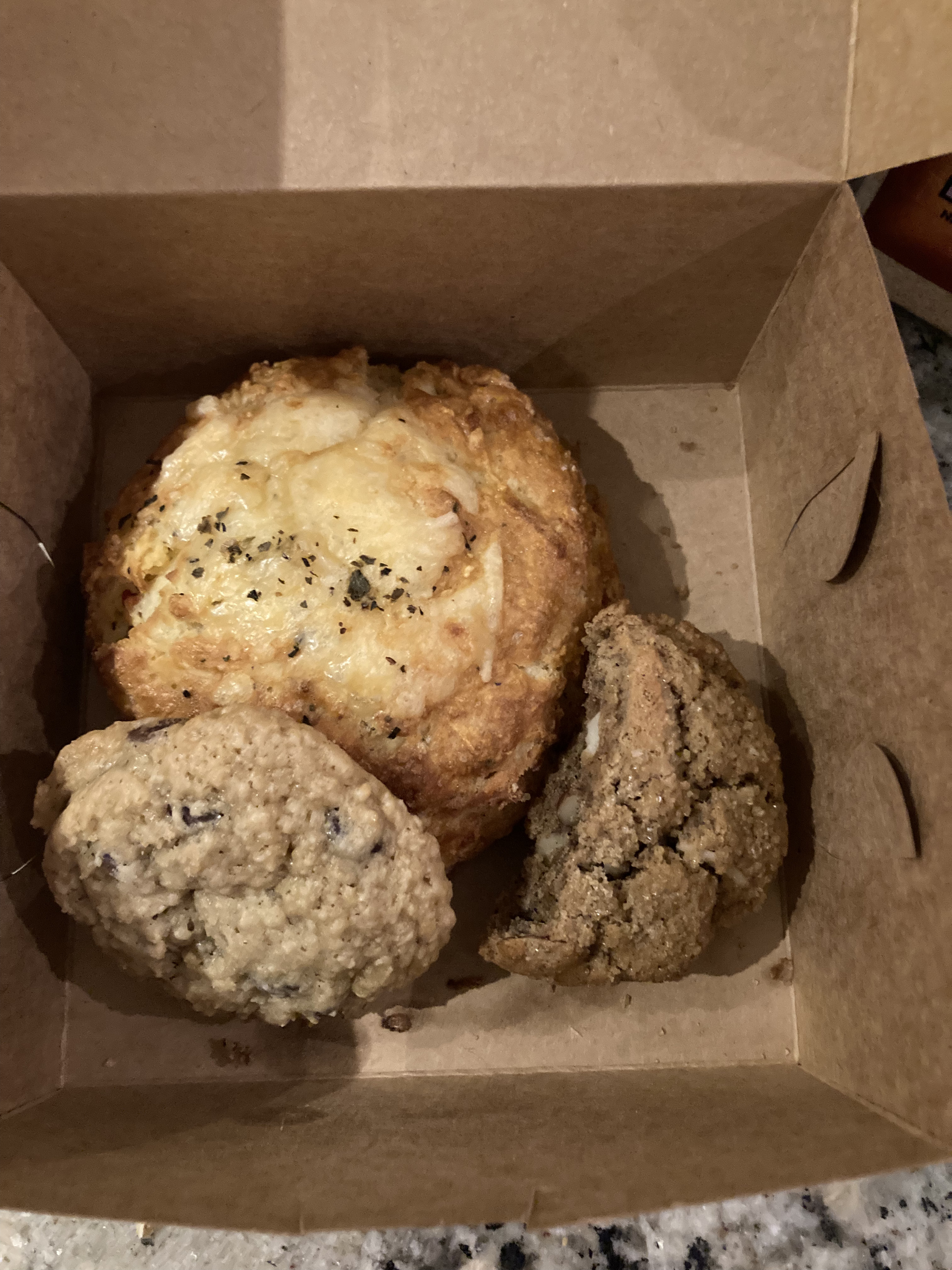 Oat choc chip and almond butter cookies were very good. Their tomato and cheese (or cheese and herb?) scone was, like their biscuit, a bit of a hybrid (scone + focaccia). I noticed that their menu had avocado toast listed for $8, so LA pricing didn’t make it this far south.