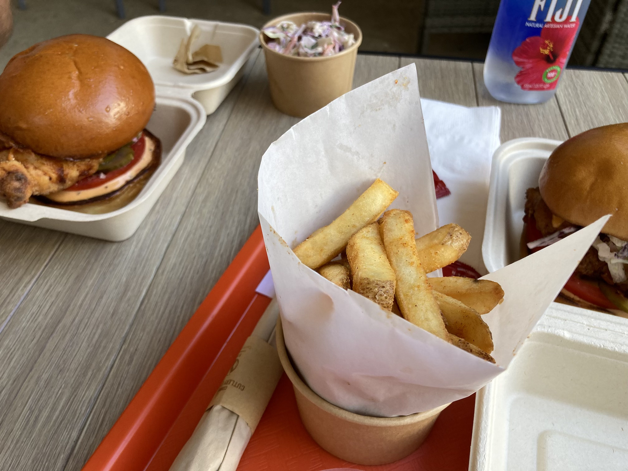 I was hoping that eating in (the patio) would reduce the chances of my fried chicken’s crust getting steamed. Nope. The part under the bun still dissolved. Rrr. Partner’s fried chicken emerged relatively unscathed. If you imagine a fast-food fried chix sandwich done to a very high standard, then you have a good idea of what you’re getting here. Do wish that the batter had some type of stronger seasoning (flavor is otherwise coming from the cole slaw). Slaw as a side was surprisingly sweet at the top of the container but more balanced lower down, so maybe someone needed to toss it (more) b/f serving? Fries were very good.