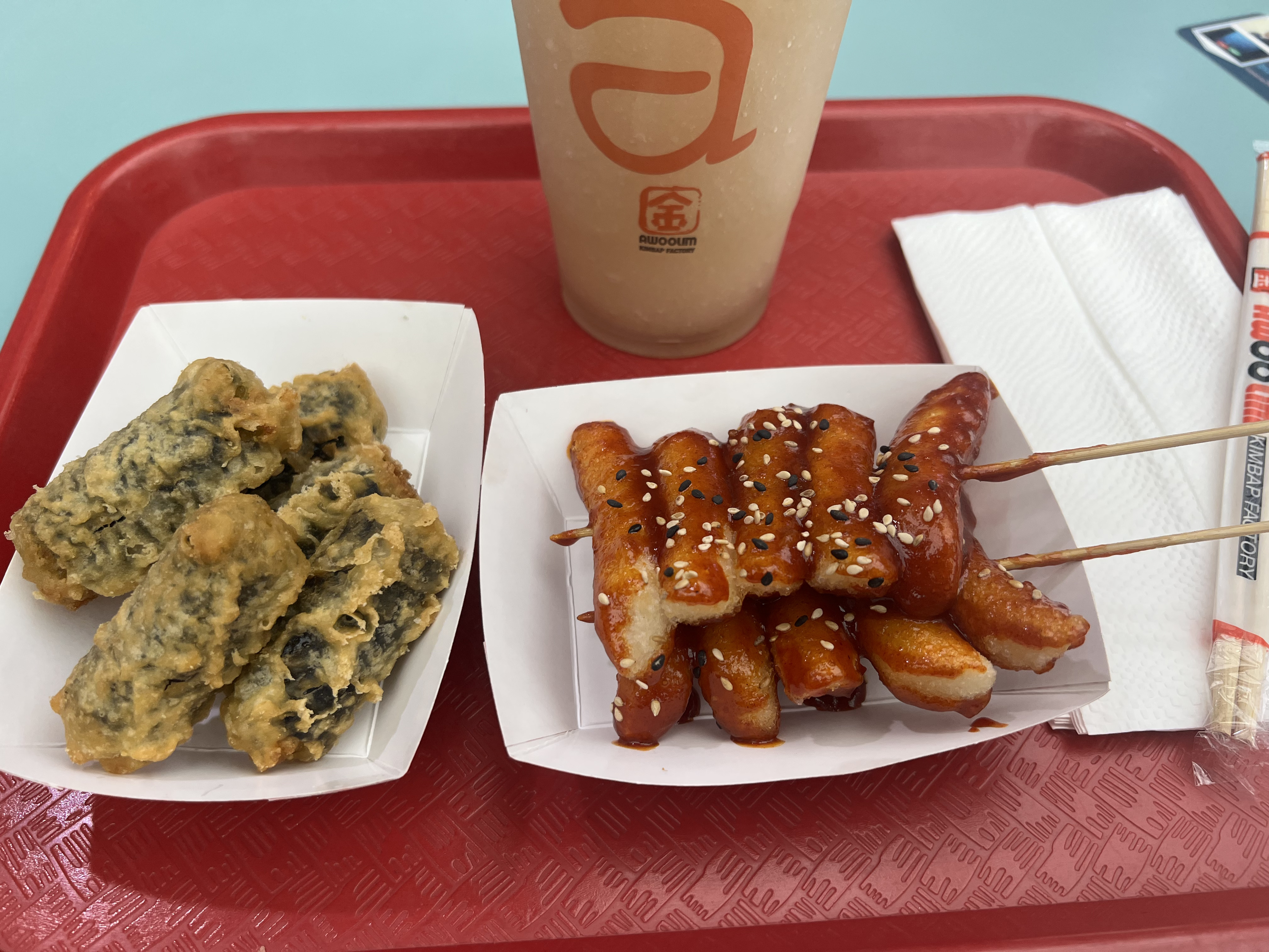 sikhye slush, dduk ggochi, fried seaweed roll with glass noodles