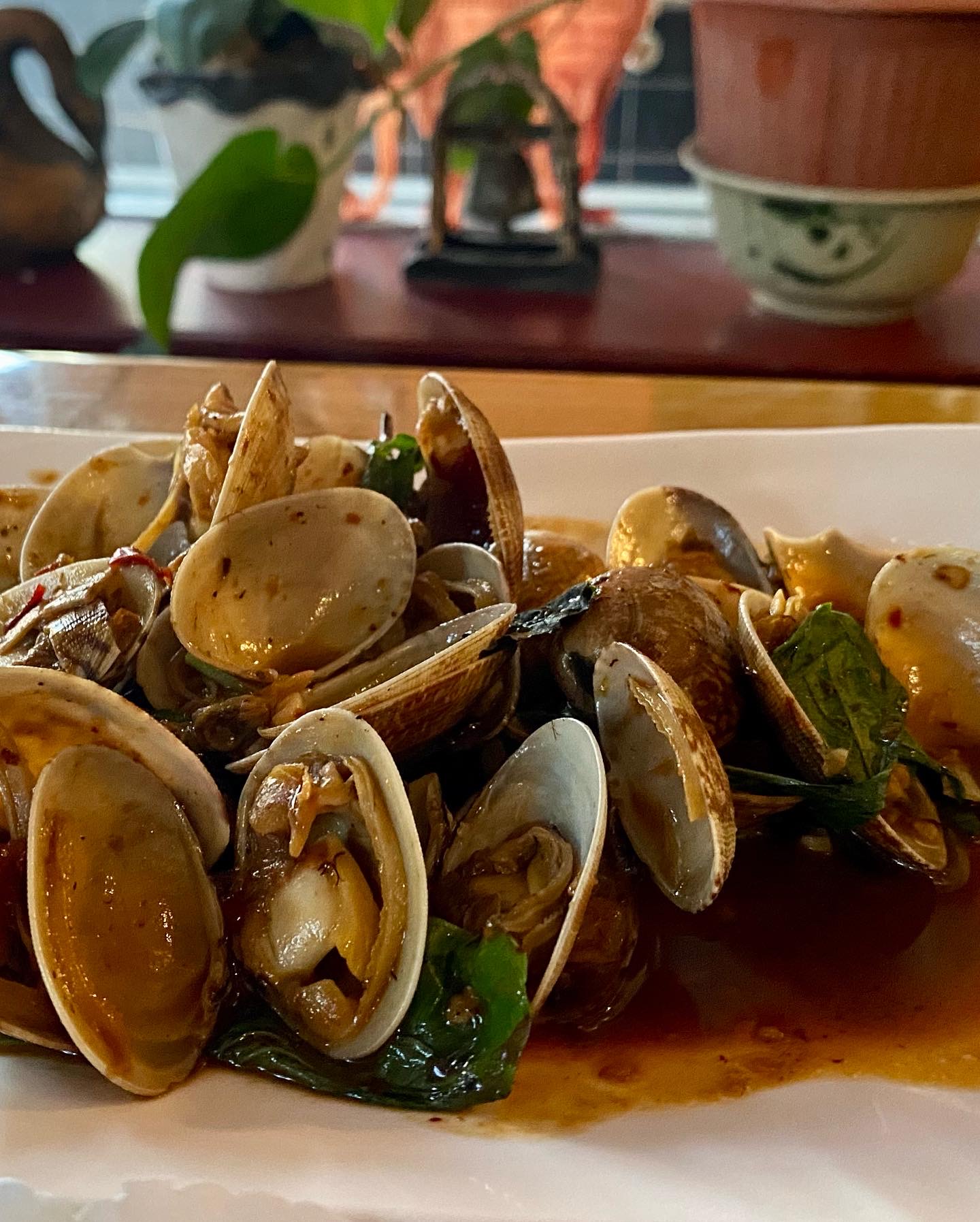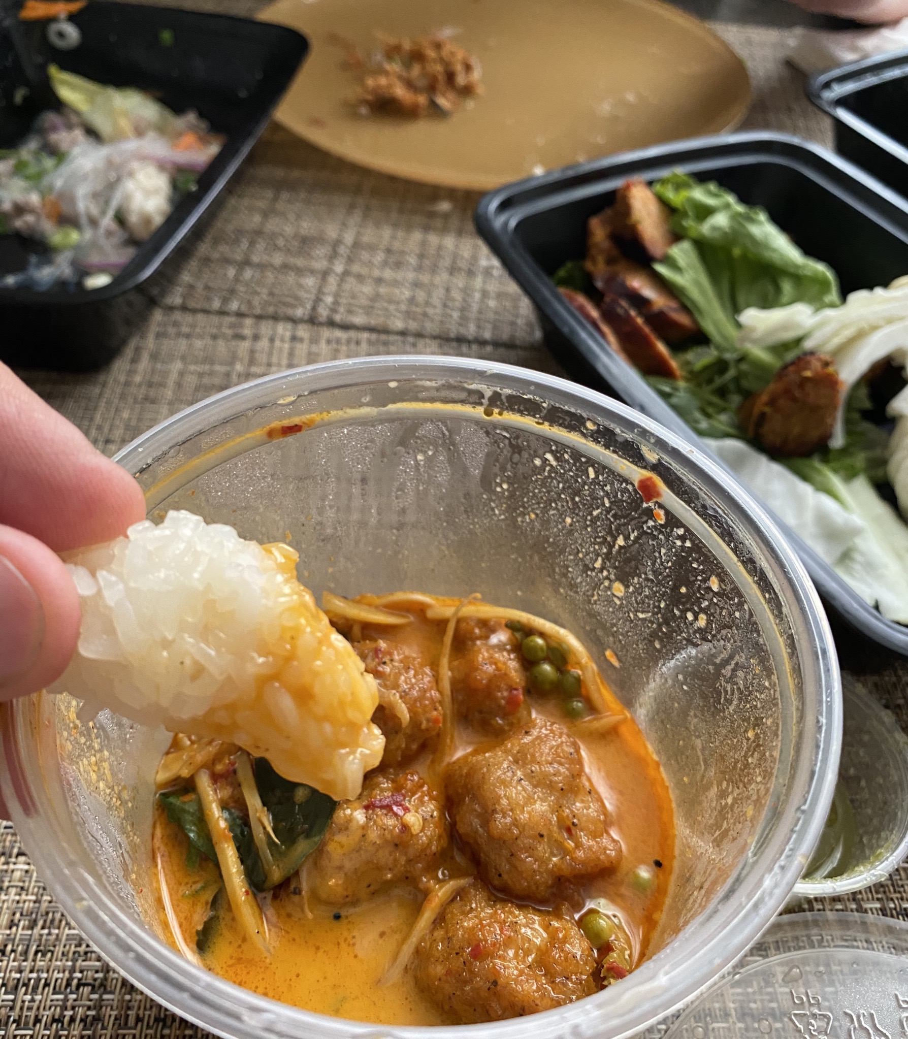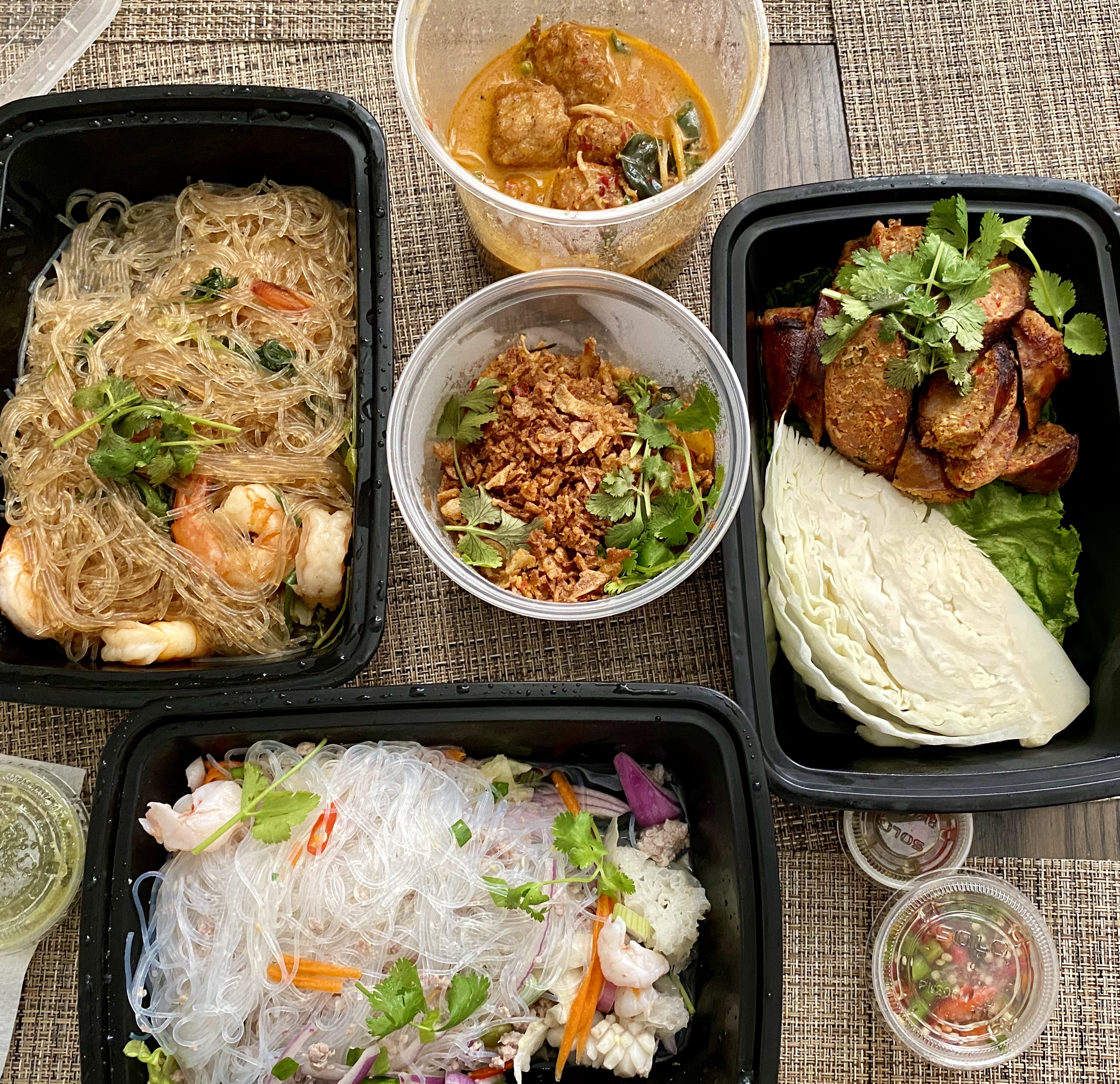 We ordered delivery. Peony says: “I liked it a lot.” I was impressed by the freshness and complexity of the curry paste for the panang curry, the balance of the tom yum, and the funkiness of the dried fish in the Chinese broccoli dish. Making real Thai food like this takes a big effort.