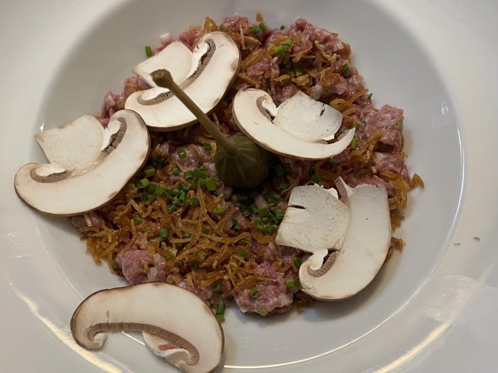 Cerf (red deer) tartare with mayonnaise, crispy shallots, and mushrooms. Nice and light.