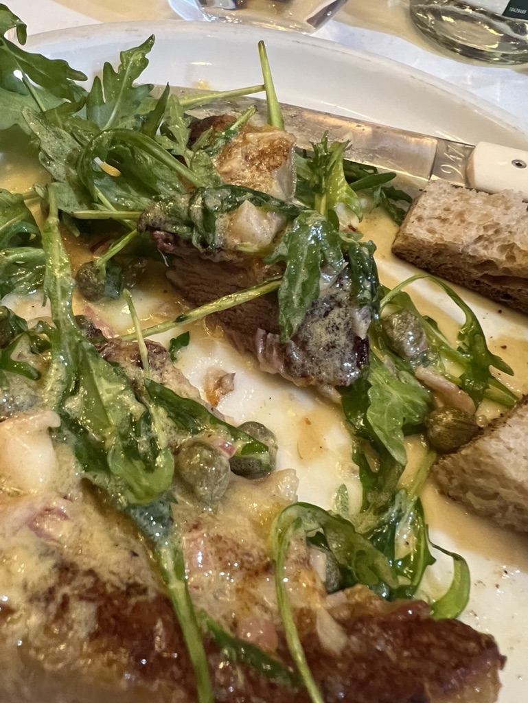 I really enjoyed the appetizer tête de veau with a light sauce ravigote - deboned calf’s head with dijon mustard, shallots, big capers, and arugula. Very crispy edge, consistent gelatinous center that was between beef tendon and mung bean jelly, with juicy cheek portion that had a texture like fatty brisket.