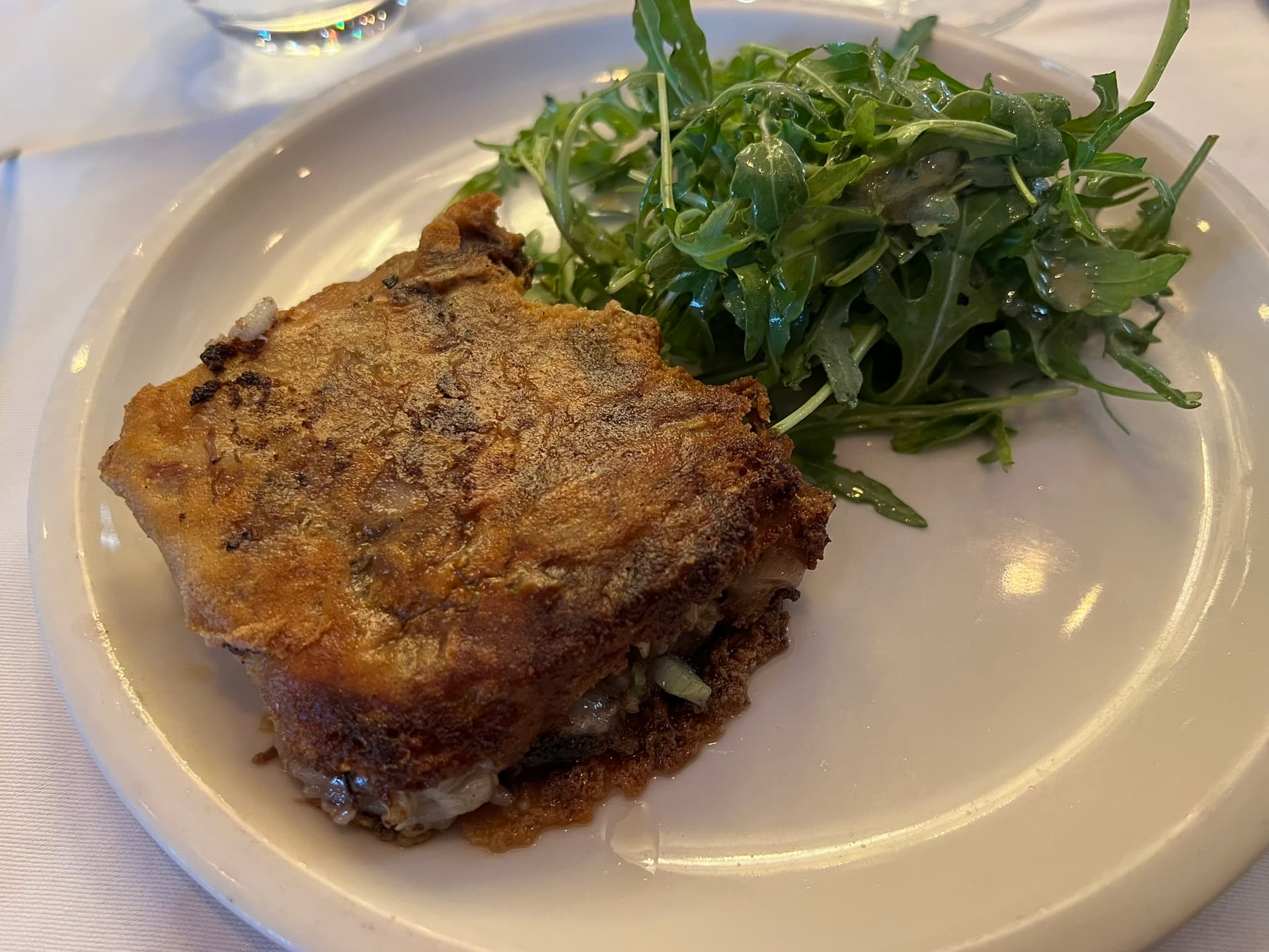 Le Severo’s pied de cochon. Super crispy on the outside, deboned gelatinous bits nicely composed on the inside. Just slippery goodness, no soft bone/cartilege (the kind with the texture of pig’s ears). Very nice product, but I wouldn’t have minded a slight sauce ravigote. Just with lightly dressed arugula.