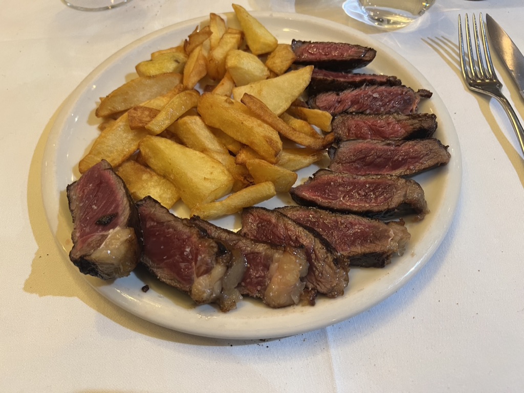 Highly recommended for steak frites (and their steak tartare as a principal plate looked very good). Old school, small room, basically they’ll only cook it medium rare or lower and not much in the way of sauces for the sirloin (aka “faux filet”) steak. They do a peppercorn sauce for the rump steak. Apparently will get very upset if you ask for ketchup with fries, but that wasn’t me.