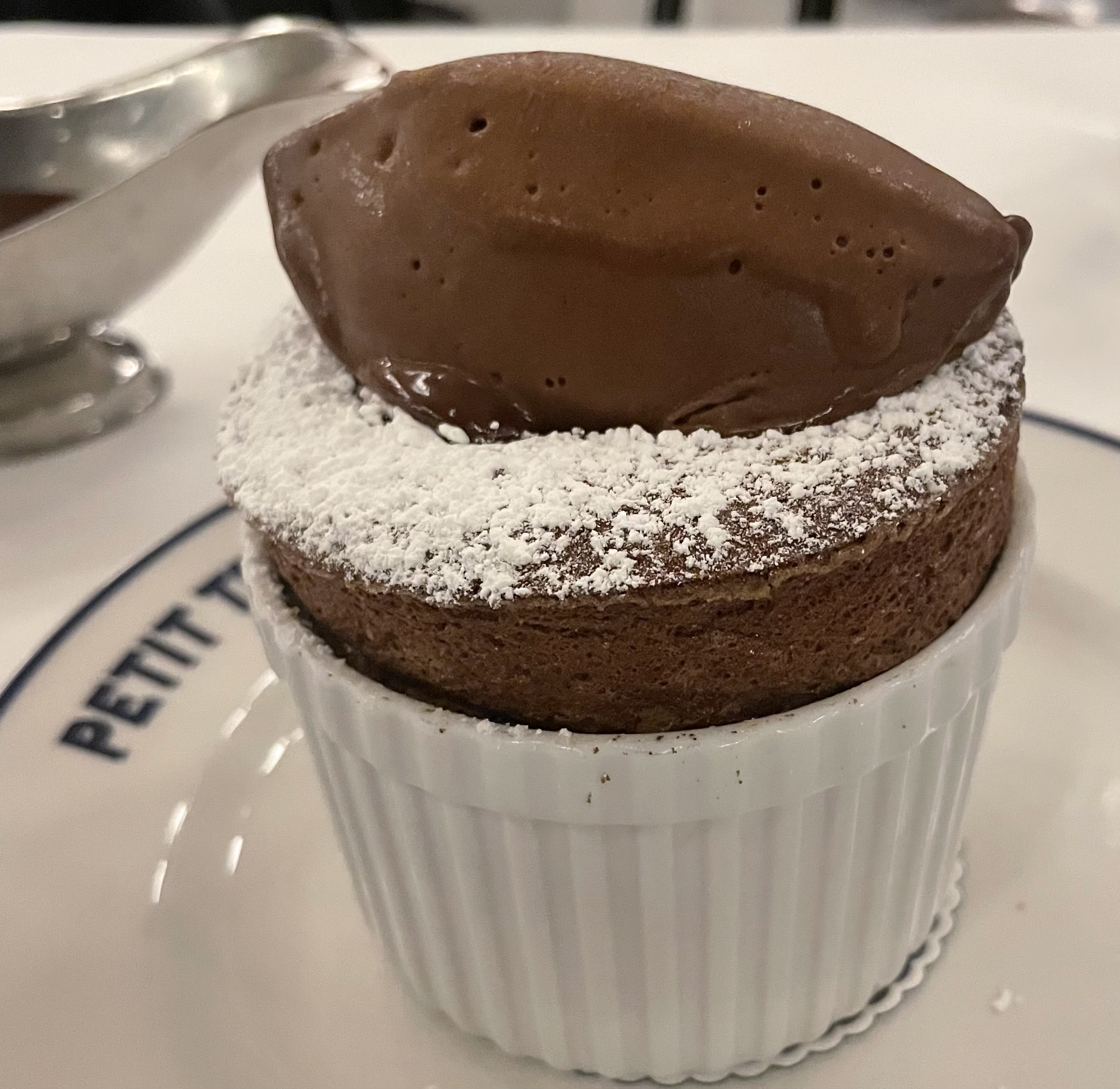 Chocolate souffle, chocolate sorbet, chocolate sauce