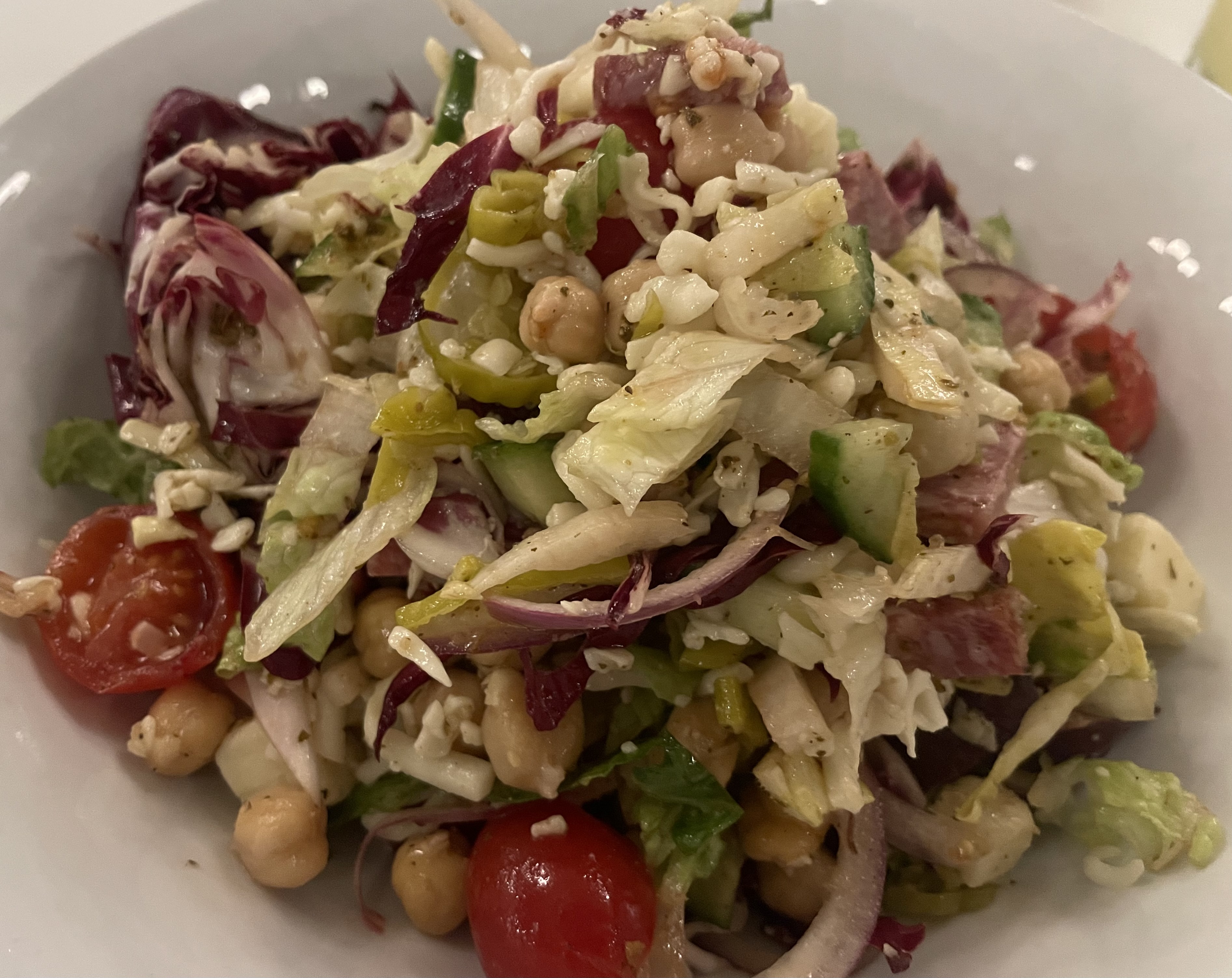 Chopped salad, radicchio, Italian salami, provolone, garbanzo beans, red wine vinaigrette