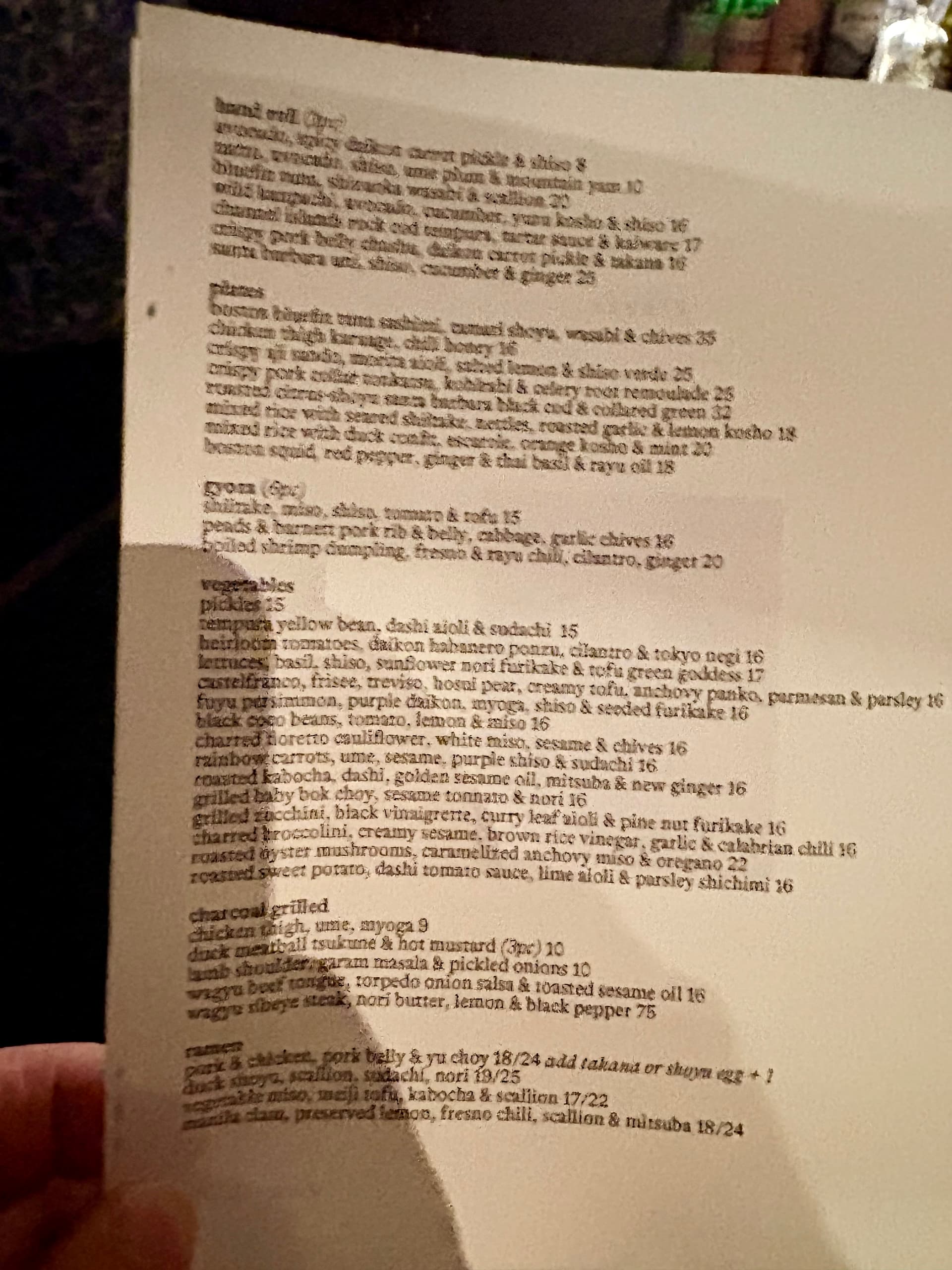 It really is wildly inconsistent - Iāve had good meals there for brunch but felt like we ordered well. I skip the noodle dishes, the handrolls, and the larger rice dishes and focus on the vegetables/grilled fish/meats and then Iām golden.