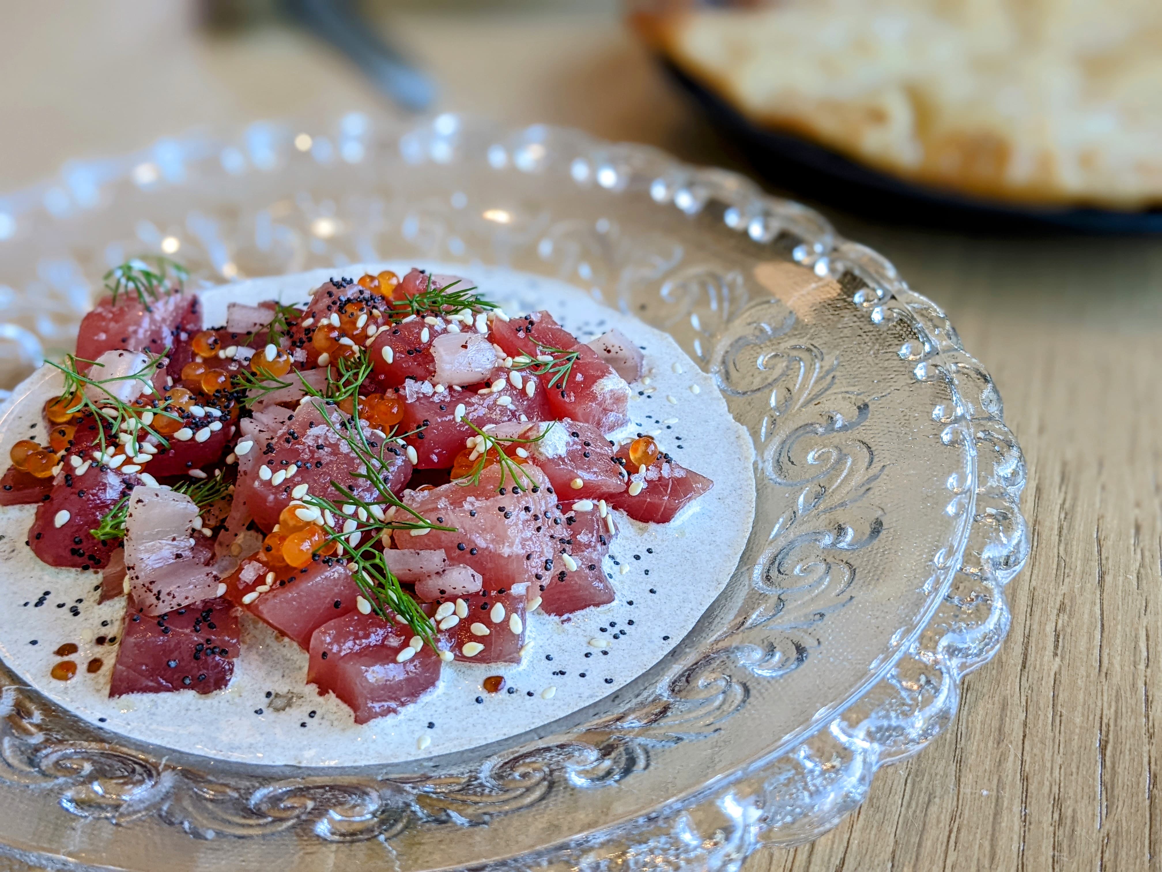 yellowfin crudo - smoked trout roe, mushroom tzatziki, pickled shallots, seeds, dill, fried laffa