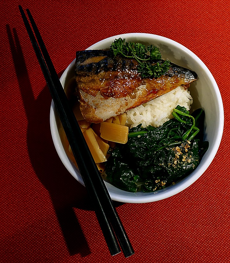 It can be amazing, if you shop right: A seasonal and delicious home dinner, courtesy of Nijiya: Saba nitsuke (simmered mackerel), horenso no ohitashi (Japanese spinach boiled with dashi), and ajitsuke menma (seasoned bamboo shoot), all on a bed of koshihikari blend rice…