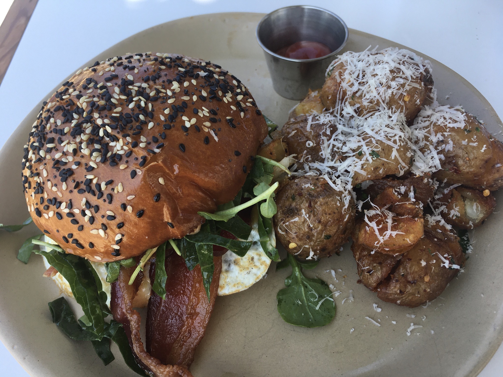 Breakfast sandwich and excellent crispy potatoes from Weiser Farms, crispy exterior and creamy interior.