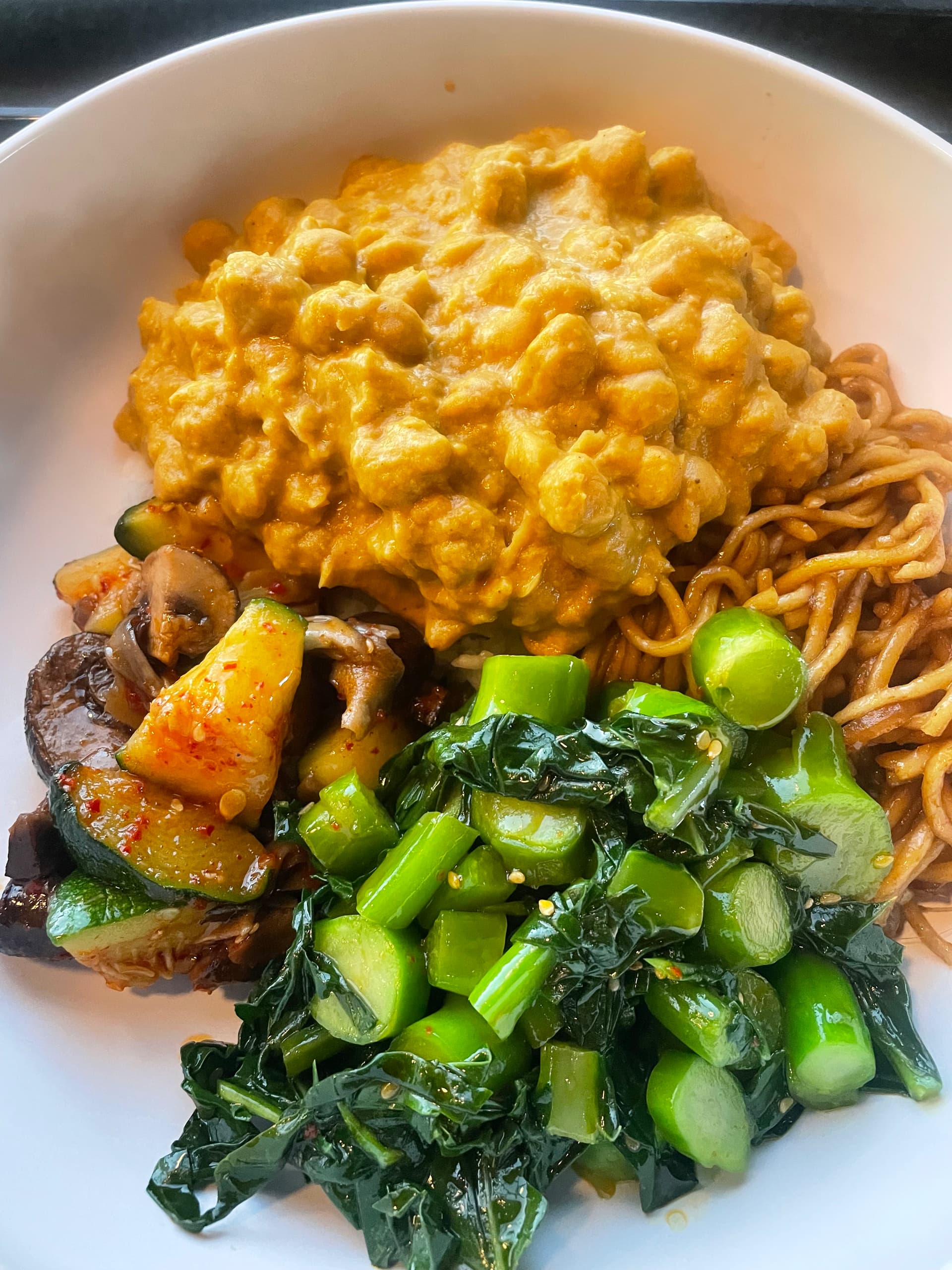 Vegan review. The veggie sides are flavorful. The chickpea curry. I think if this was served more warm/hot than the aromatics/spices will come out more. Like others have said the temperature of the food is room temp. Intentional? Typical steam table takeout the longer it sits the worse it gets. Can’t beat the price for $12.99!