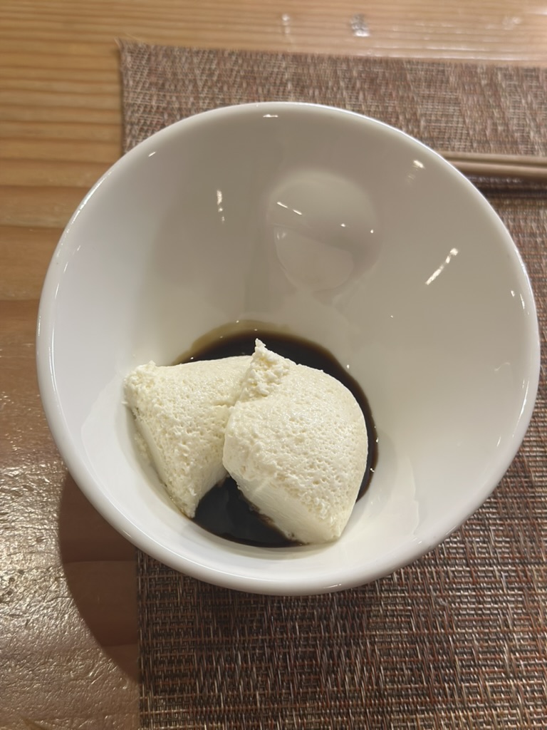 Shin’s signature starter - conch (top left), cucumber / seaweed / jellyfish (top right), crab flavored tofu in spoon, tofu with wasabi (in front), tiny crab, ginger (in middle), vegetables (bottom left)